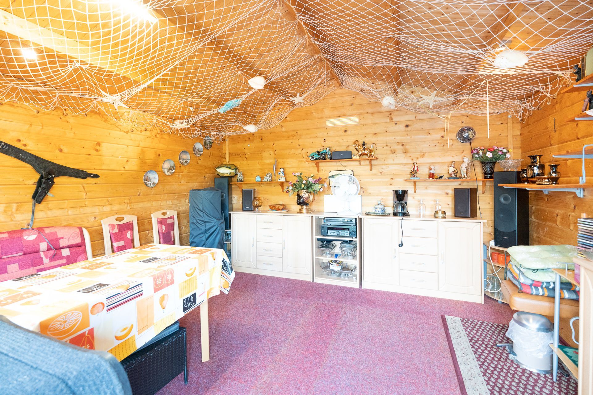 Das Grundstück ist liebevoll angelegt und komplett eingefriedet, sodass Privatsphäre gewährleistet ist. Im Außenbereich befindet sich eine überdachte Terrasse mit Stromanschluss, einem Ventilator und der Möglichkeit, Seitenwände anzubringen.