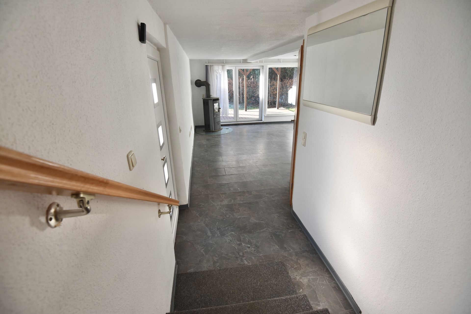 Im Erdgeschoss befinden sich ein großes Wohnzimmer mit Kaminofen und direkten Ausgang auf die überdachte Terrasse. Neben dem Wohnzimmer befindet sich ein kleines Bürozimmer.