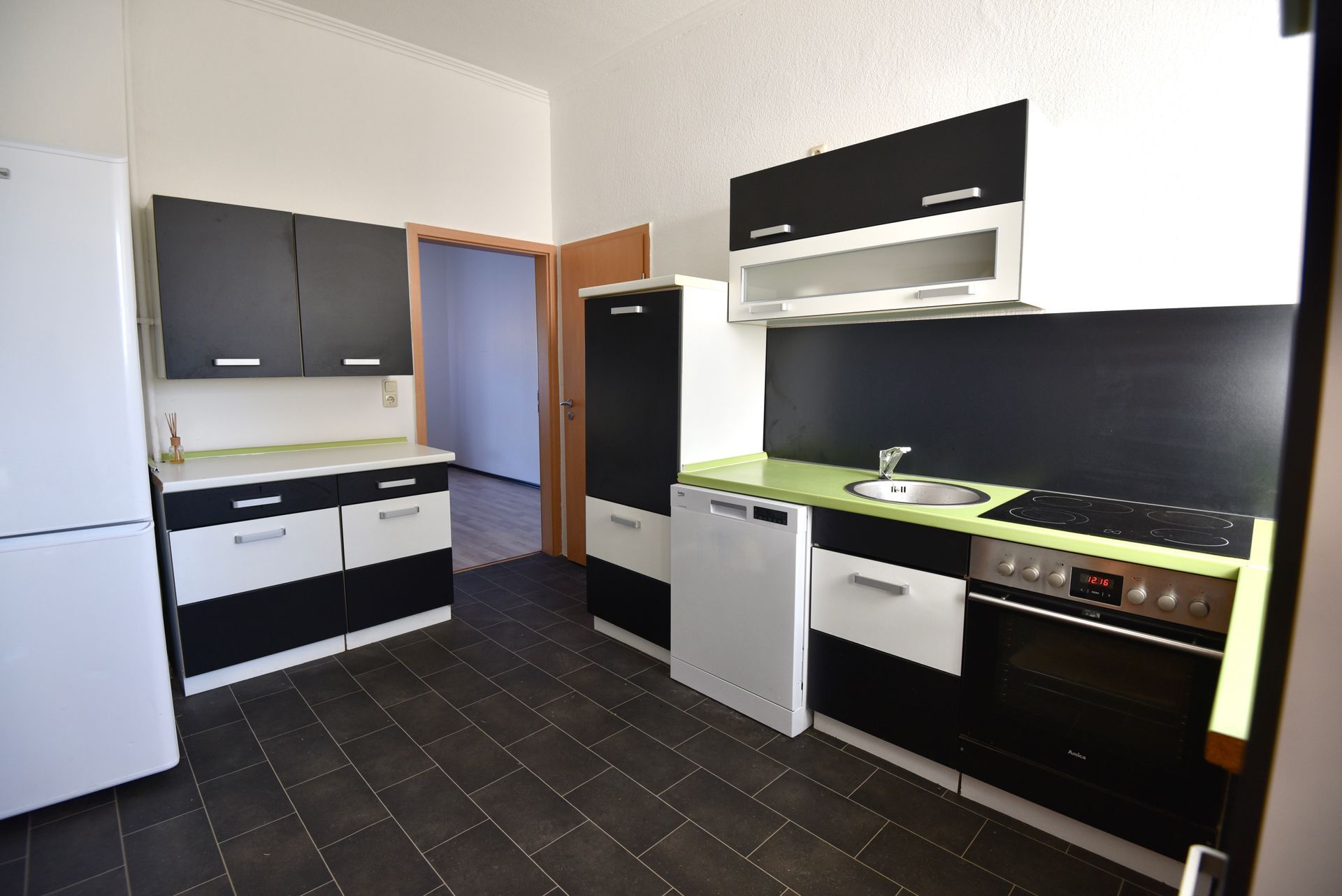 Die Einbauküche ist mit einem Backofen, Cerankochfeld, Geschirrspüler sowie reichlich Stauraum ausgestattet.