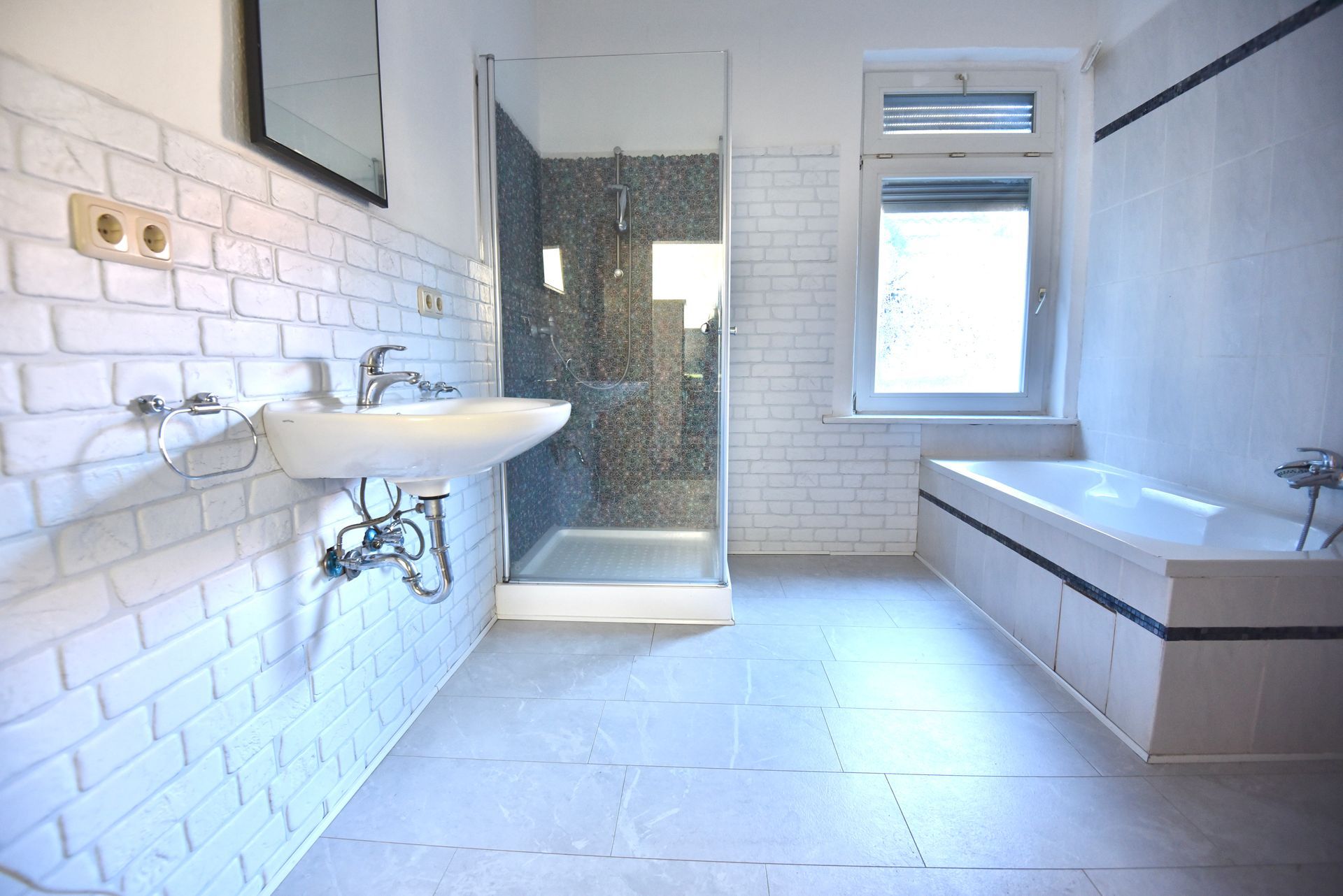 Das helle Badezimmer verfügt über eine Dusche und eine Badewanne. Die Warmwasserversorgung ist über einen energiesparenden Durchlauferhitzer geregelt.