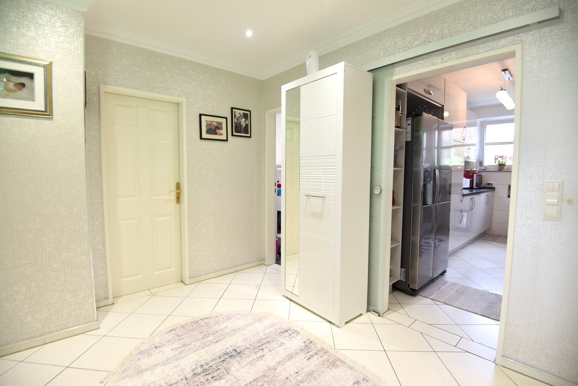 Diese besondere Wohnung verfügt über einen klassischen Grundriss, alle Räume sind von dem quadratisch geschnittenen Flur aus zu erreichen. Der Eingangsbereich ist hell gefliest und mit einer Garderobe ausgestattet.