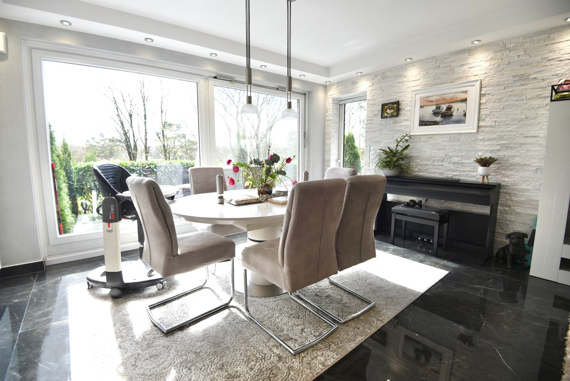 Mit einer Wohnfläche von ca. 31 m2 überzeugt das Wohnzimmer mit hochwertigen Hochglanz Feinsteinzeugboden und einem herrlichen Blick auf die große Terrasse und in den Garten. Diverse, separat schaltbare Downlights sind in der Decke integriert und luminieren das Wohnzimmer in einem geschmackvollen Ambiente.