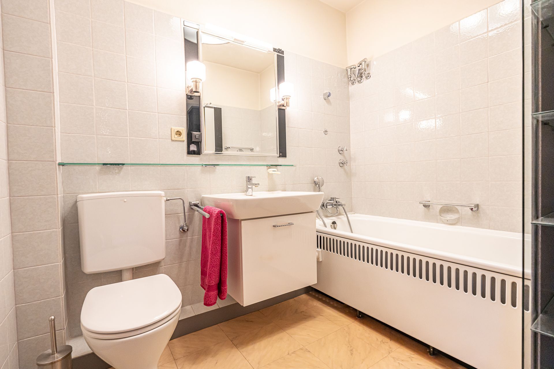 Das Badezimmer ist mit einer Wanne ausgestattet und bewahrt dabei den Charme des Baujahres.
