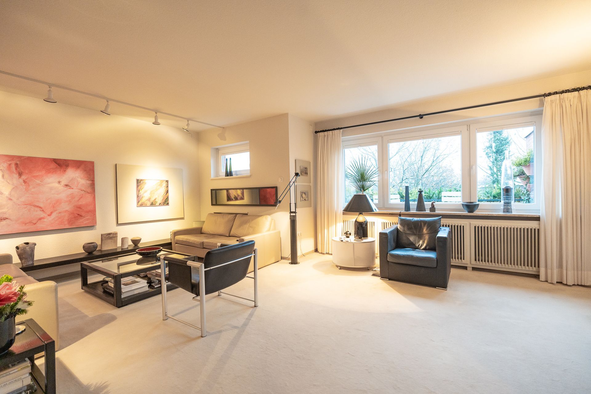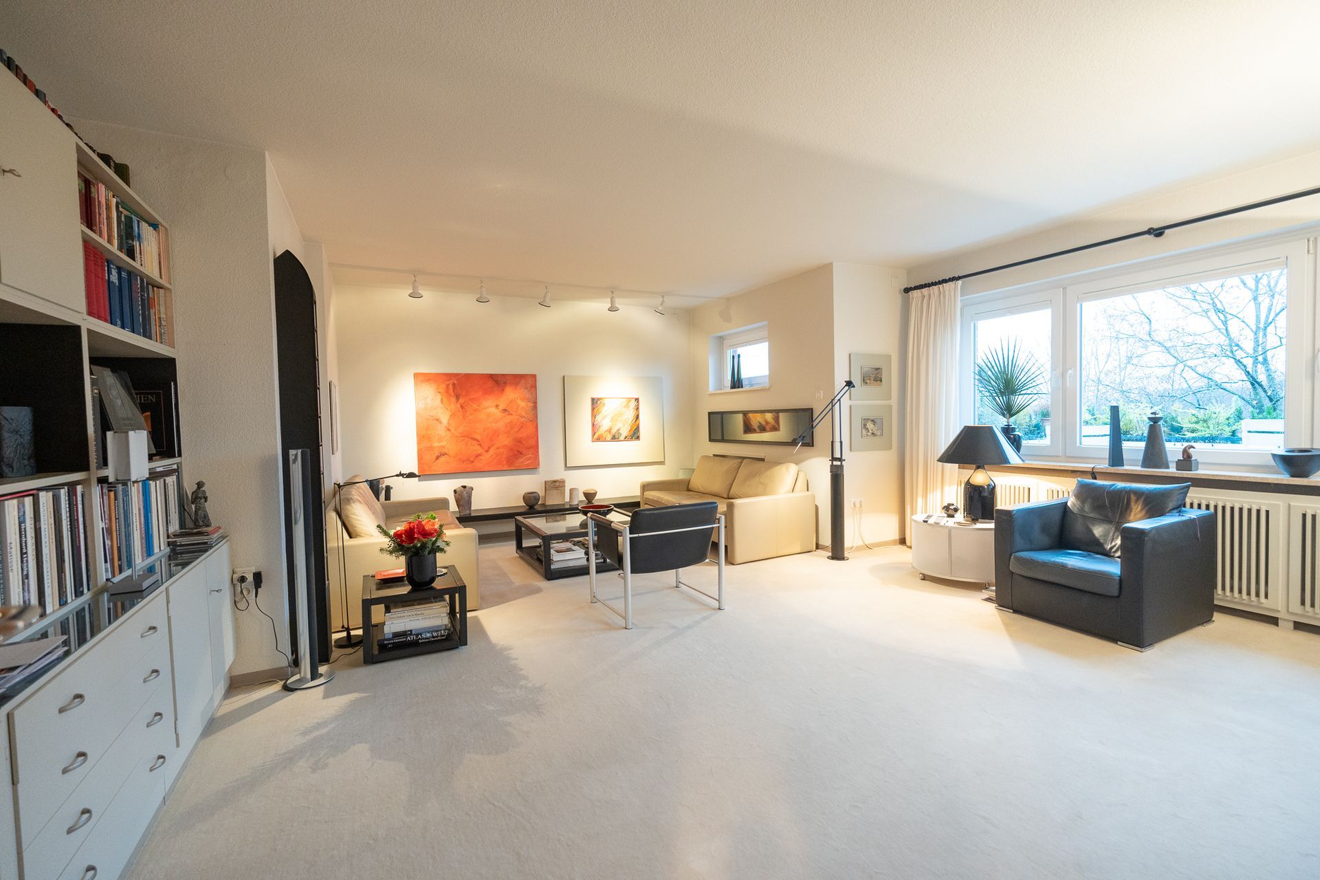 Die großen Fenster in sämtlichen Räumen lassen viel Tageslicht herein und schaffen eine einladende Atmosphäre.