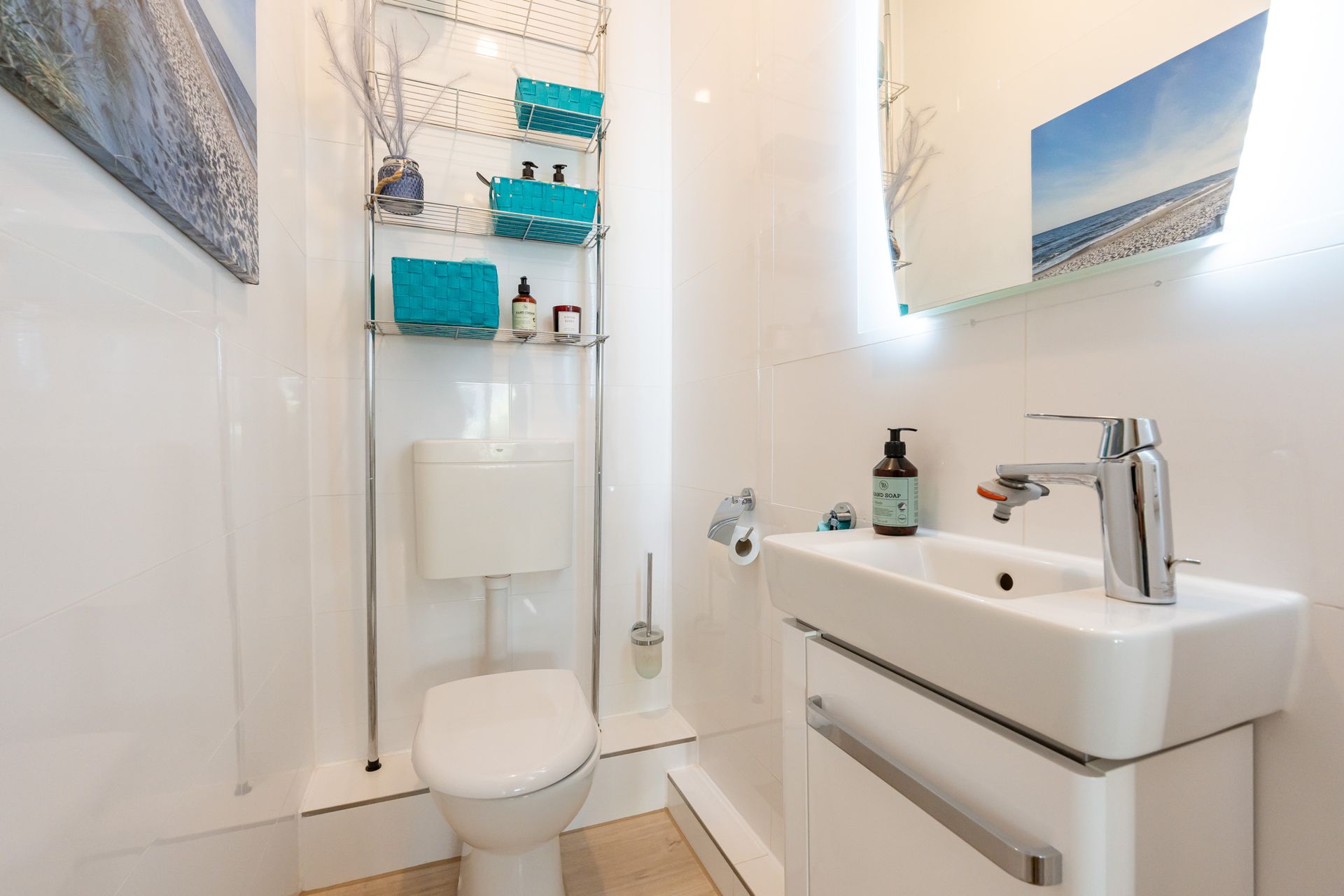 Das Badezimmer wurde aufwendig im Jahr 2021 modernisiert und beeindruckt mit einer LED-Beleuchtung in der Decke, einer Badewanne mit Tür und einem stilvollen Waschtisch.