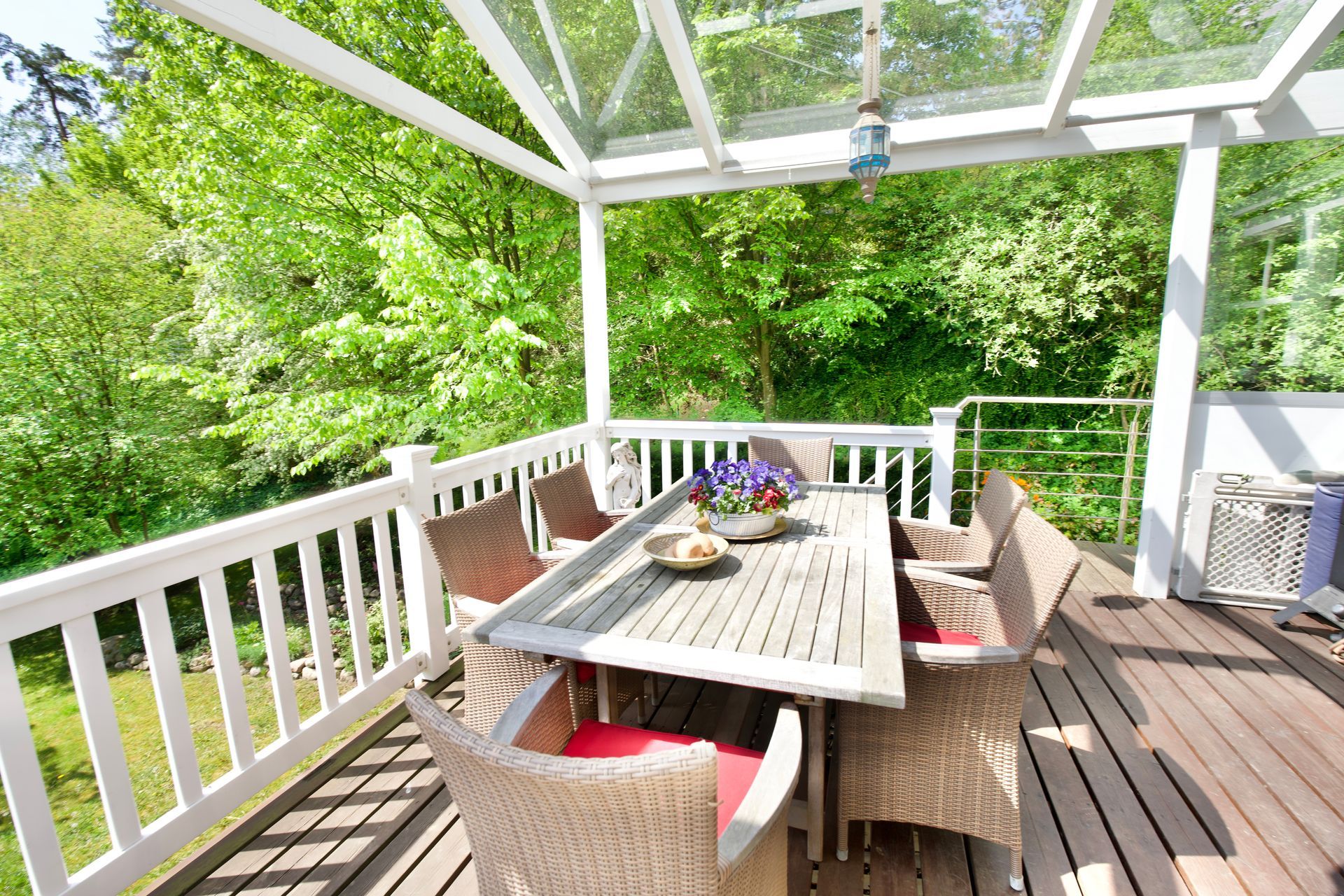 Der große Balkon ist über den Wohnbereich zugänglich und teilweise überdacht. Von hieraus genießen Sie einen herrlichen Panoramablick auf die Ausläufer der Harburger Berge. Von dem Balkon gelangen Sie über eine Treppe direkt in den Garten.