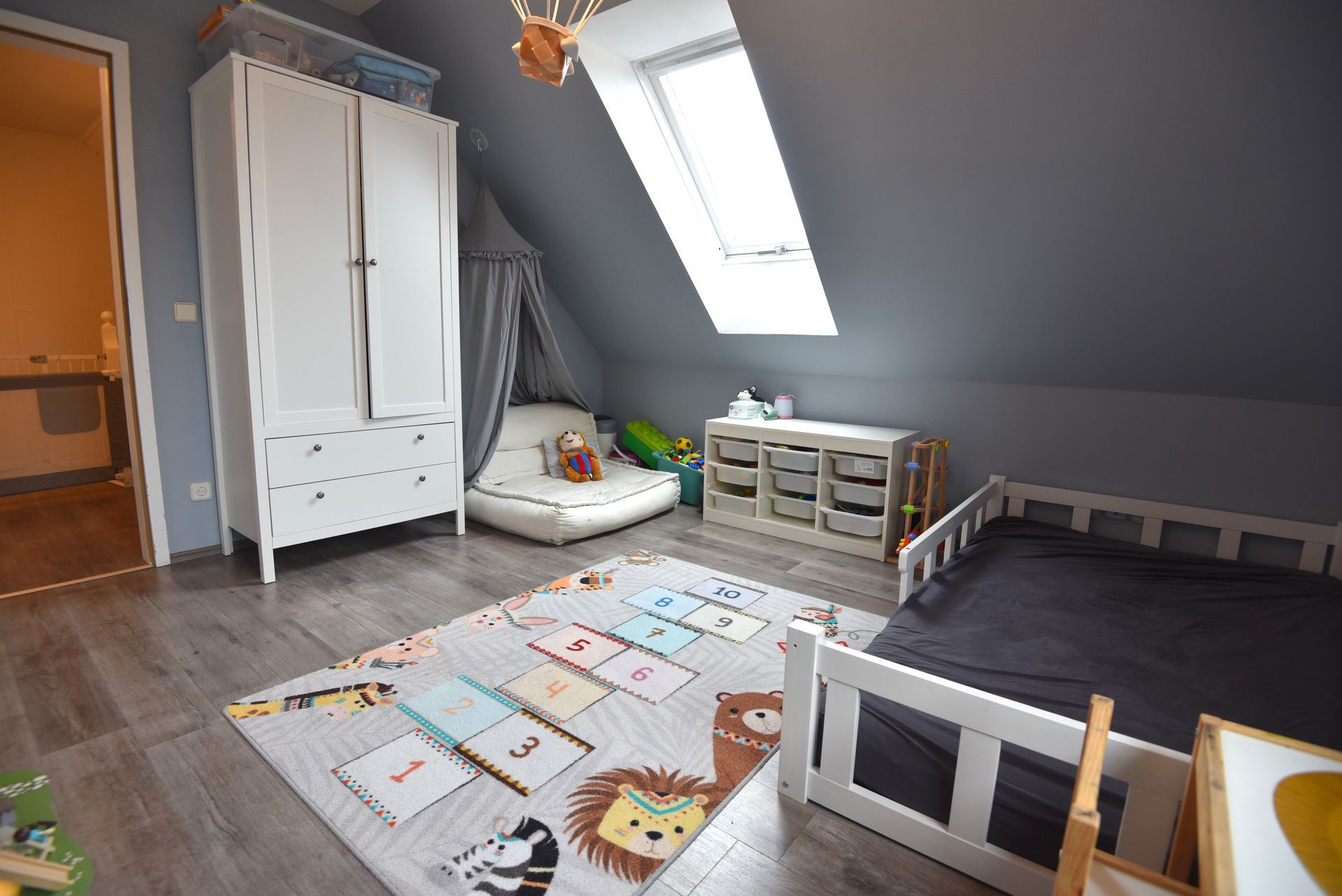 Über eine weiße Holztreppe erreicht man das Obergeschoss. Hier befinden sich ein gut geschnittenes Schlafzimmer, zwei große Kinderzimmer und ein helles Badezimmer. Das Badezimmer verfügt über Fußbodenheizung und besitzt eine große Badewanne.