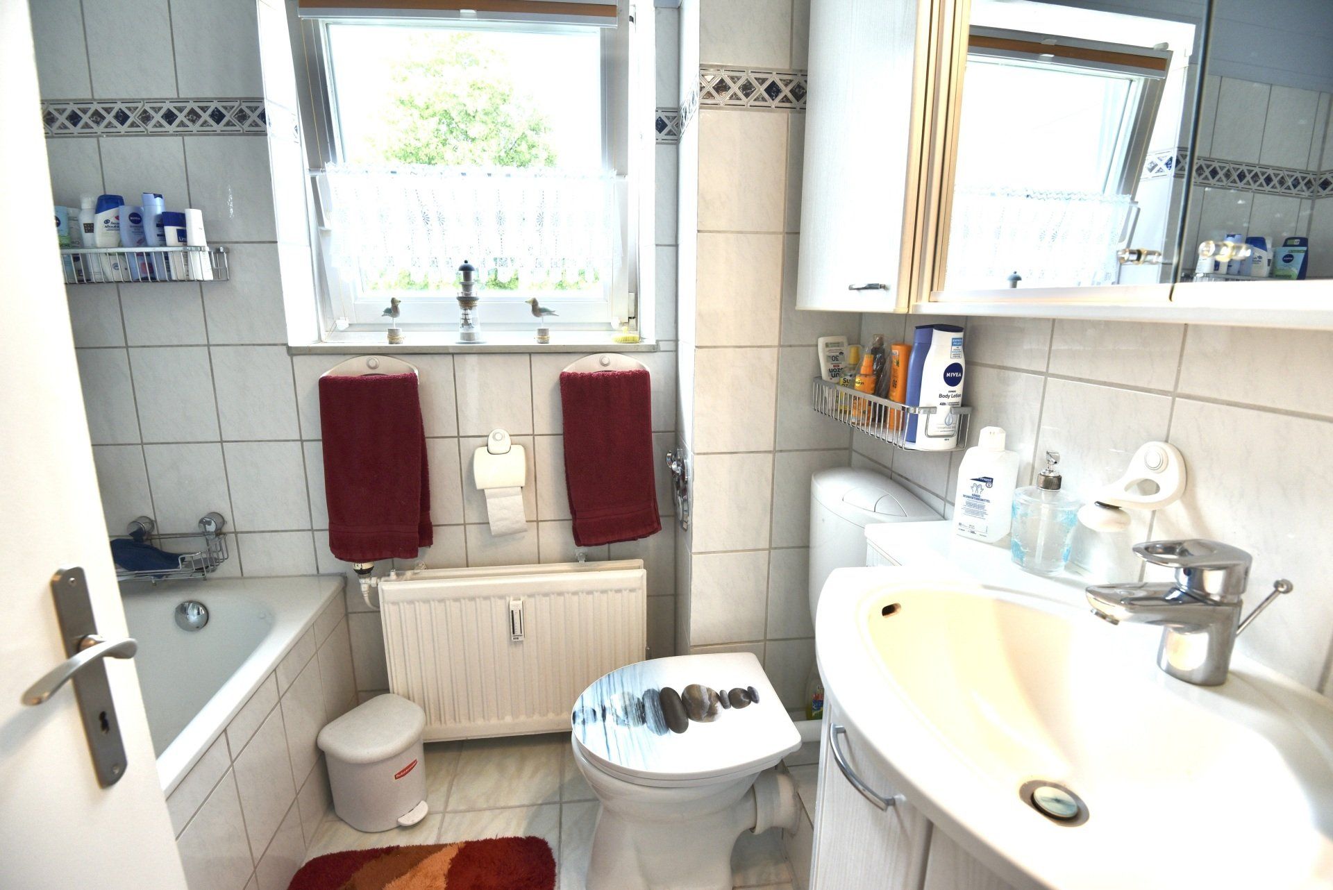 Das helle Badezimmer wird durch das große Fenster mit viel Tageslicht verwöhnt und ist mit einer Badewanne ausgestattet.