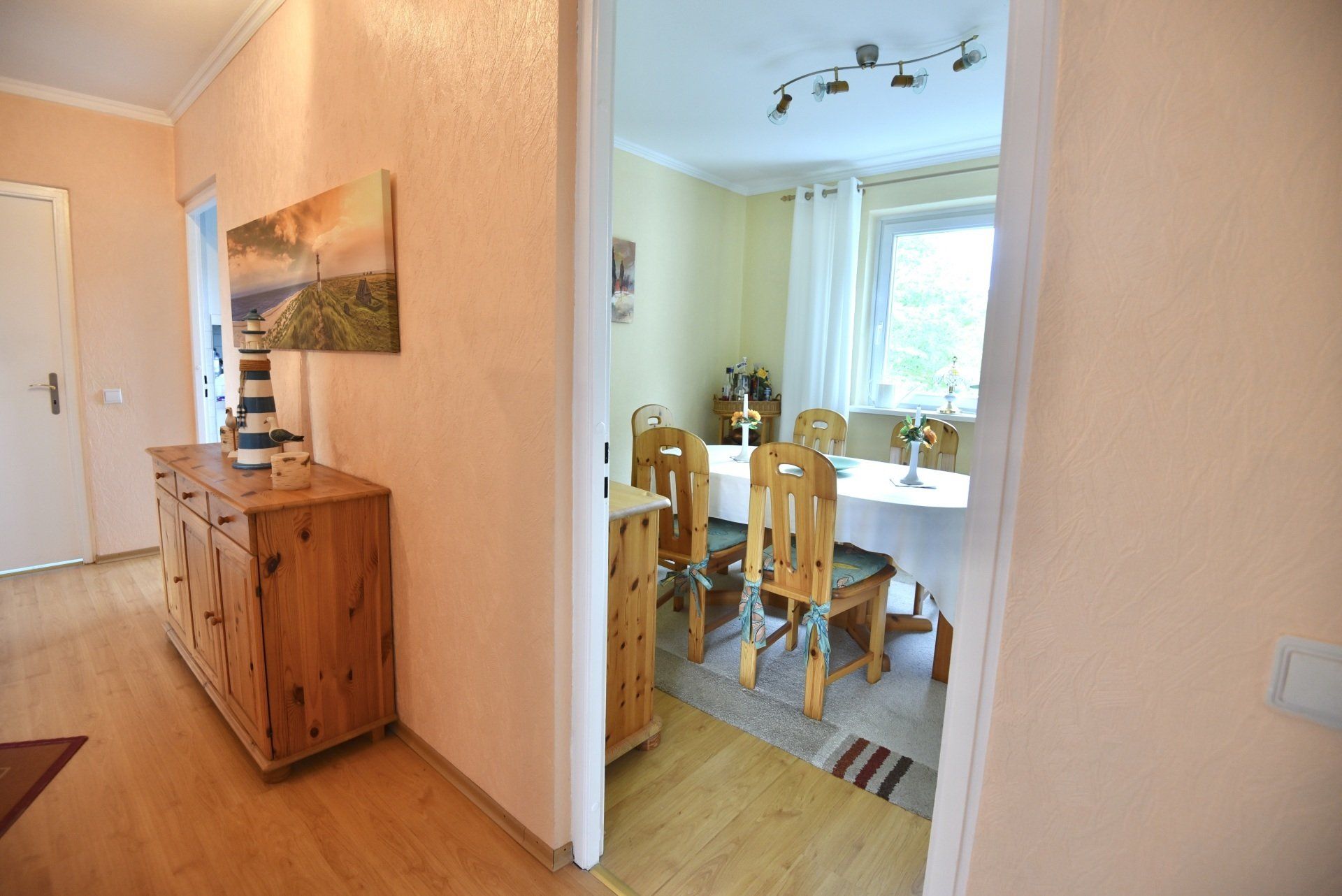 Die geräumige Wohndiele bildet den Mittelpunkt der Wohnung und bietet Platz für eine Sitz- und Essgelegenheit.