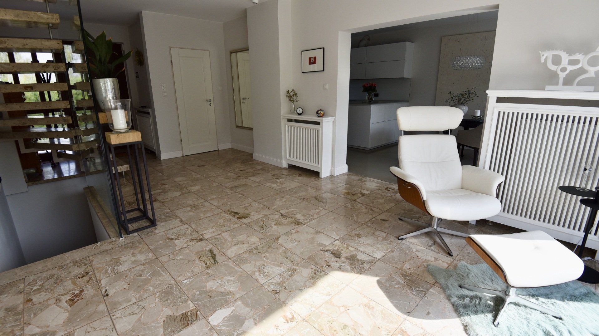 Im Erdgeschoss besticht die Immobilie durch die offene Raumaufteilung, sämtliche Wohnräume gehen ineinander über und sind durch die großen Fenster gut belichtet.