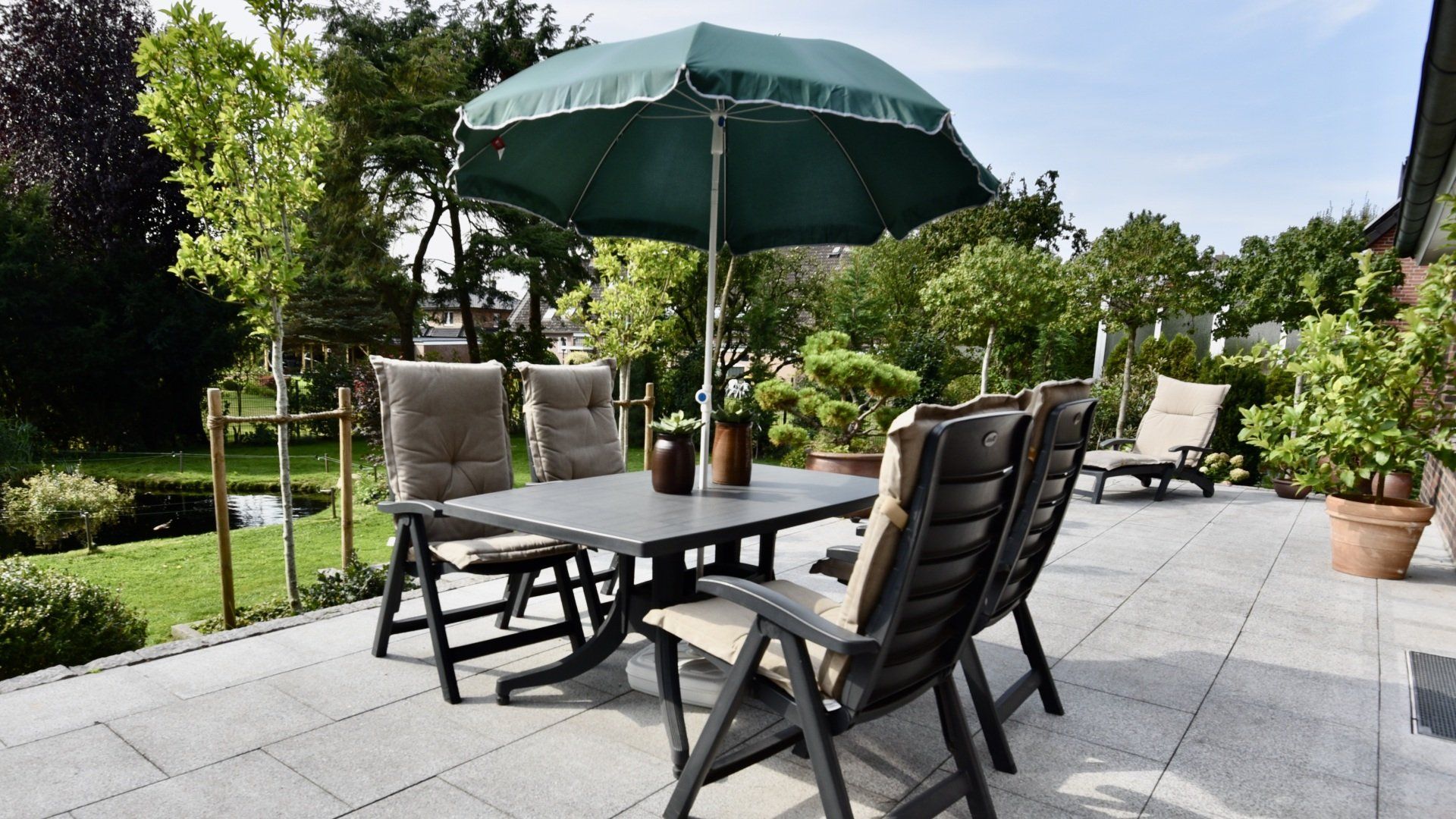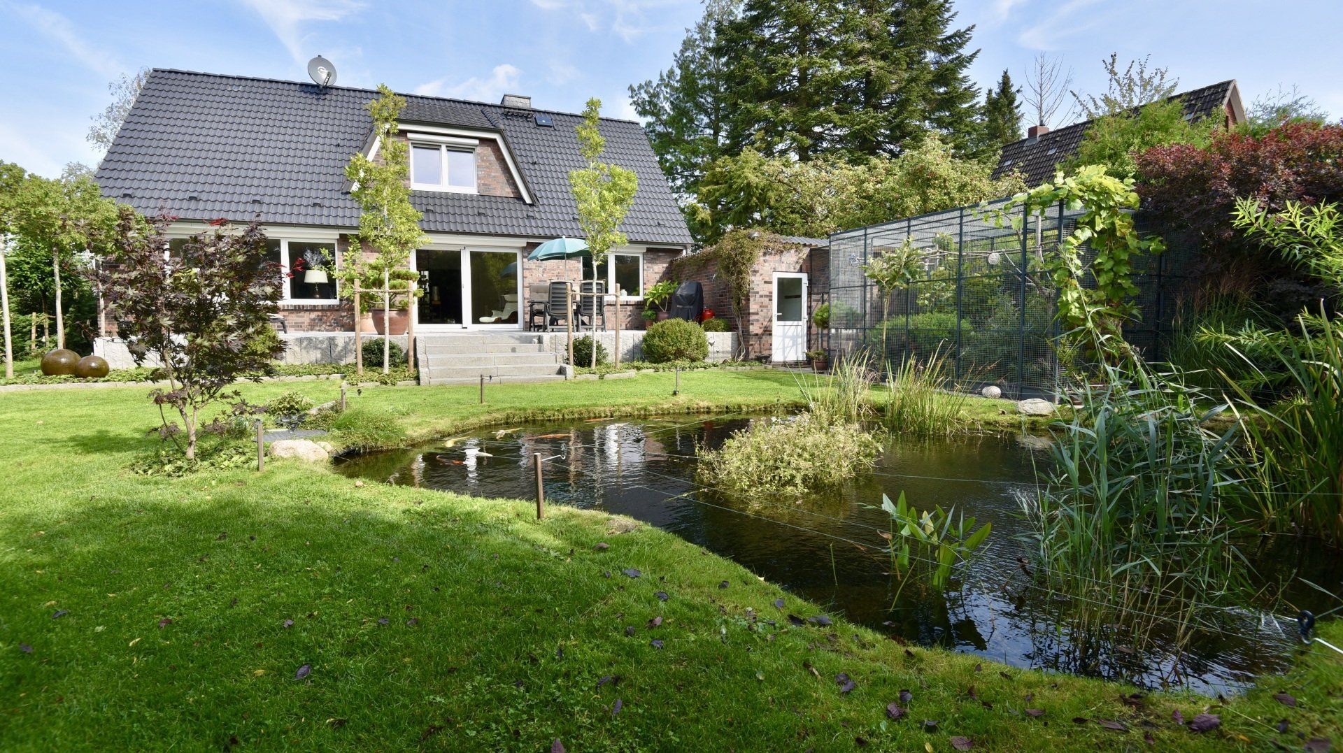Das 800 m2 große Grundstück ist nach Süden ausgerichtet und bietet einen Gartenteich, eine Doppelgarage und eine große Terrasse.