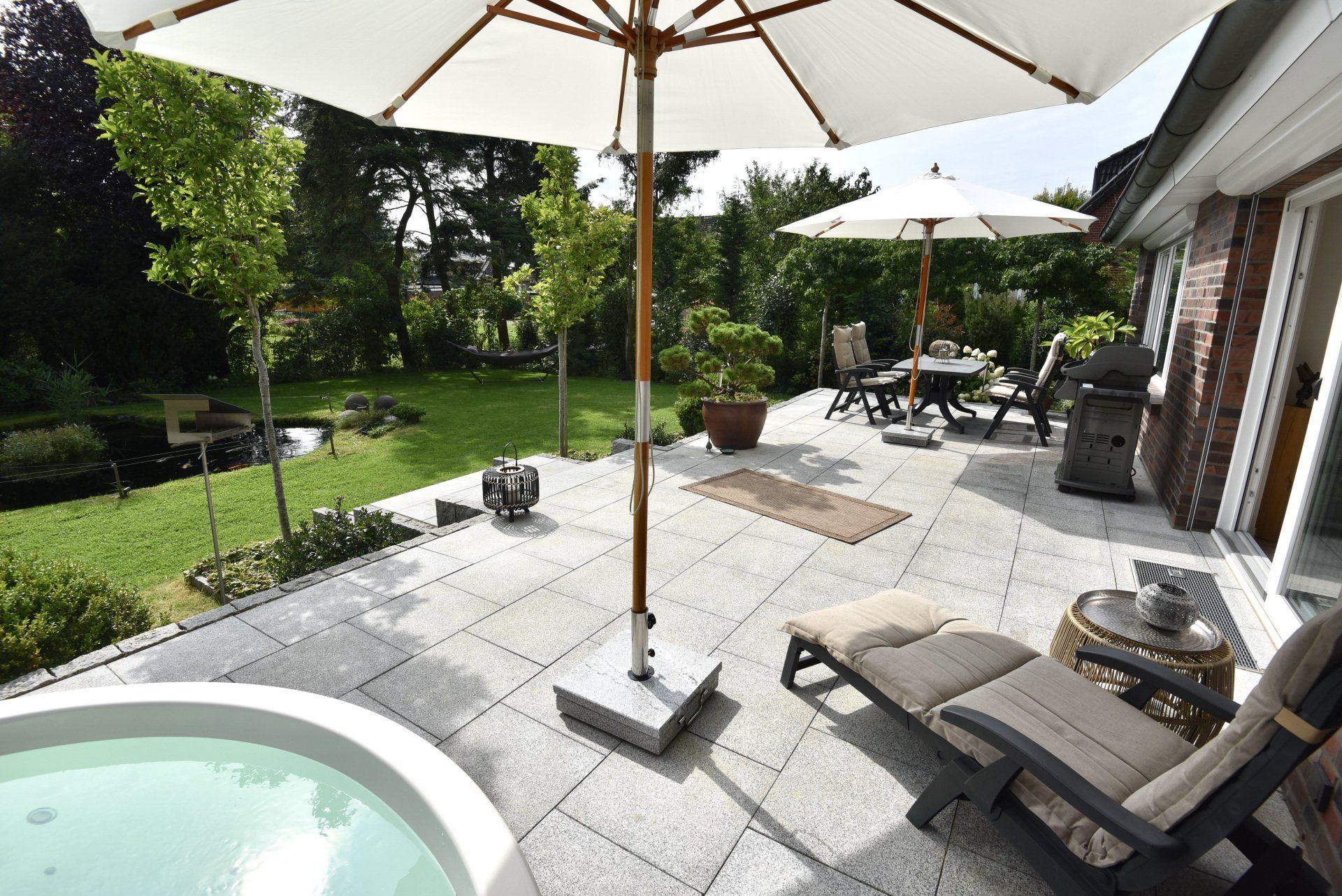 Der ca. 45 m2 große Terrassenbereich besticht durch einen 2m breiten Jacuzzi mit Filteranlage, welcher an warmen Sommertagen eine Abkühlung für bis 10 Personen bietet.