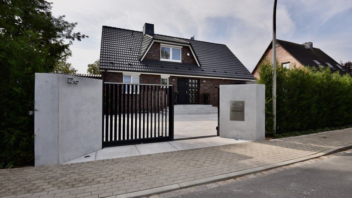 Diese Immobilie fällt auf! Eine moderne Toranlage mit zwei großen Betonstehlen sowie der puristisch gepflasterte Eingangsbereich mit 1m x 1xm großen Sichtbetonplatten heißt Sie in Ihrem neuen Zuhause willkommen. Ihre PKWs finden in der großen, 6 m breiten Doppelgarage ausreichend Platz.