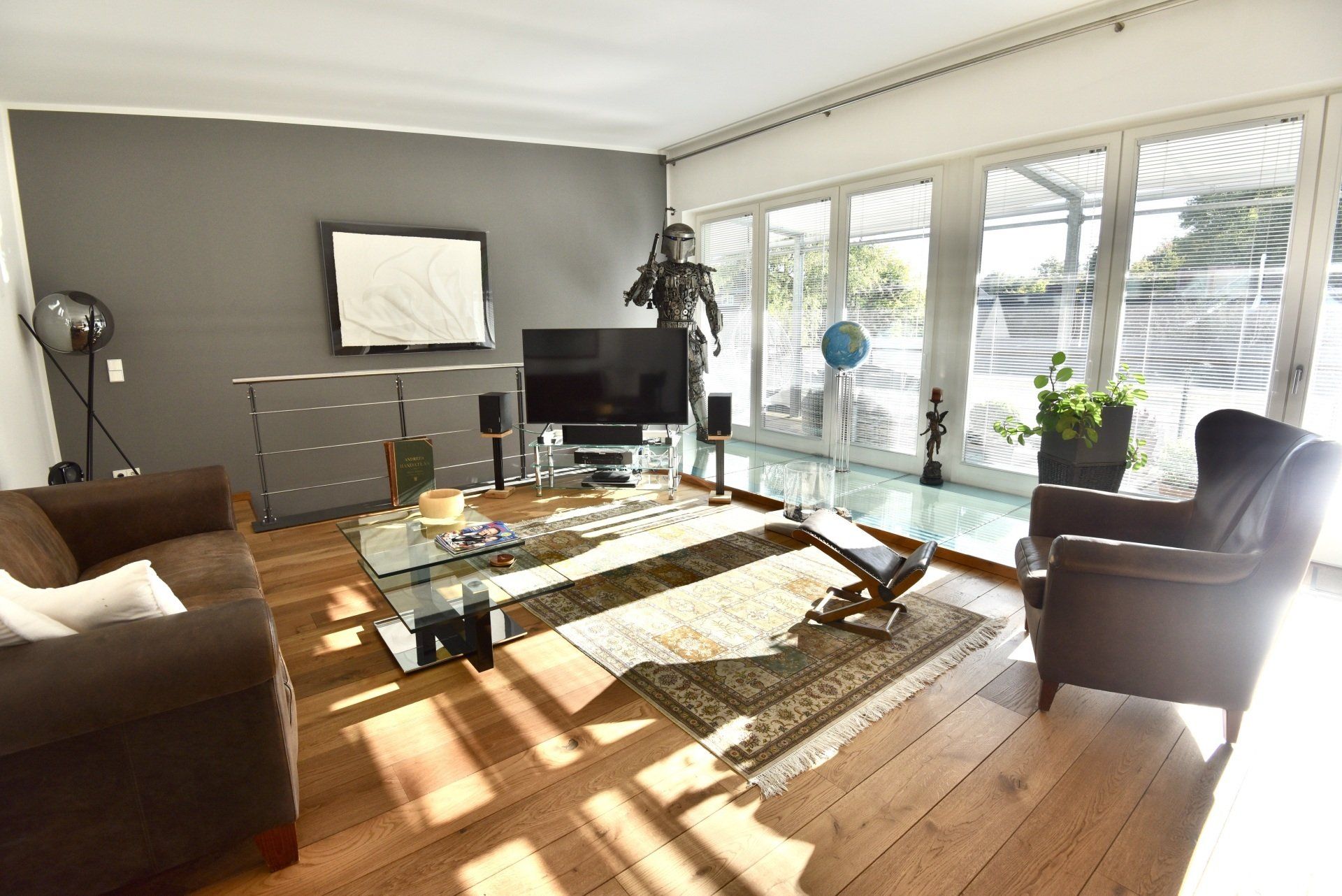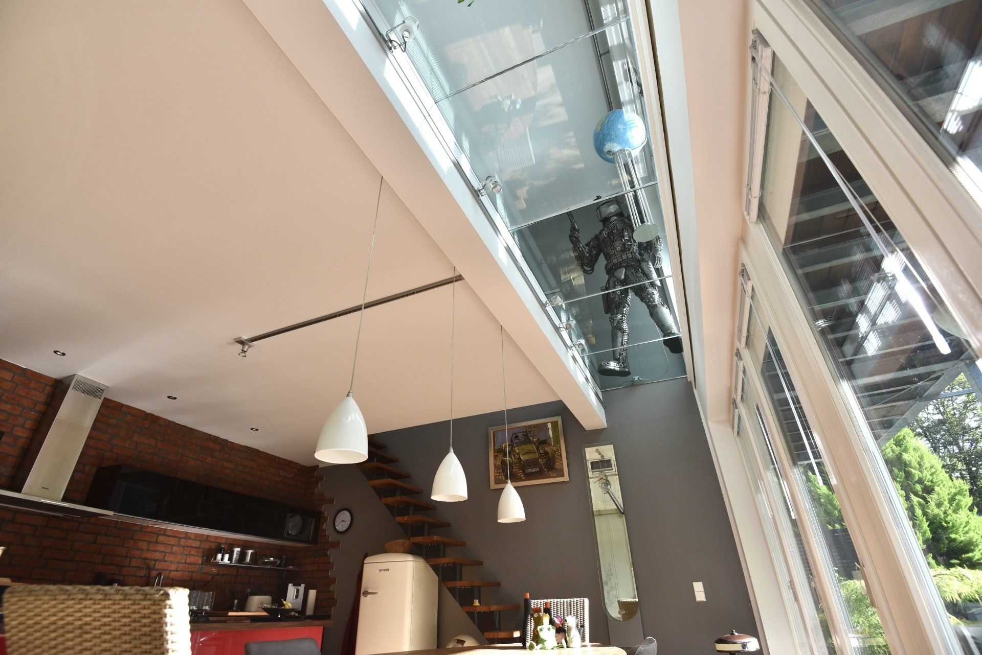 In der 1. Wohnetage befindet sich der lichtdurchflutete und offen gestaltete Wohn- und Essbereich, welcher einen vielfältig nutzbaren und äußerst wohnlichen Lebensmittelpunkt bietet. Diese Etage beeindruckt durch den imposanten Blick durch die Glaselemente in die obere Etage und die vielen Fensterelemente mit Ausgang auf die über 10 m lange Loggia.
