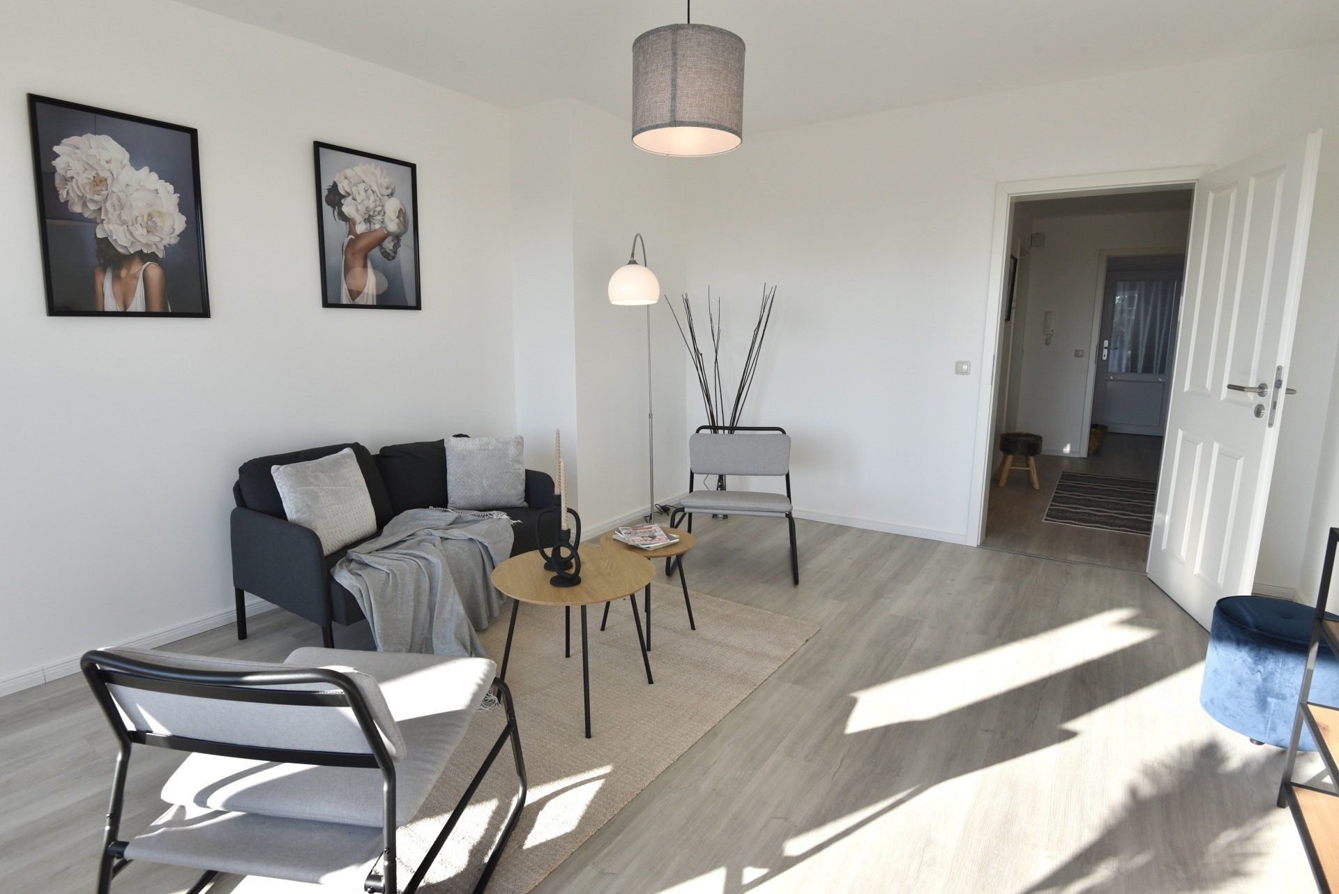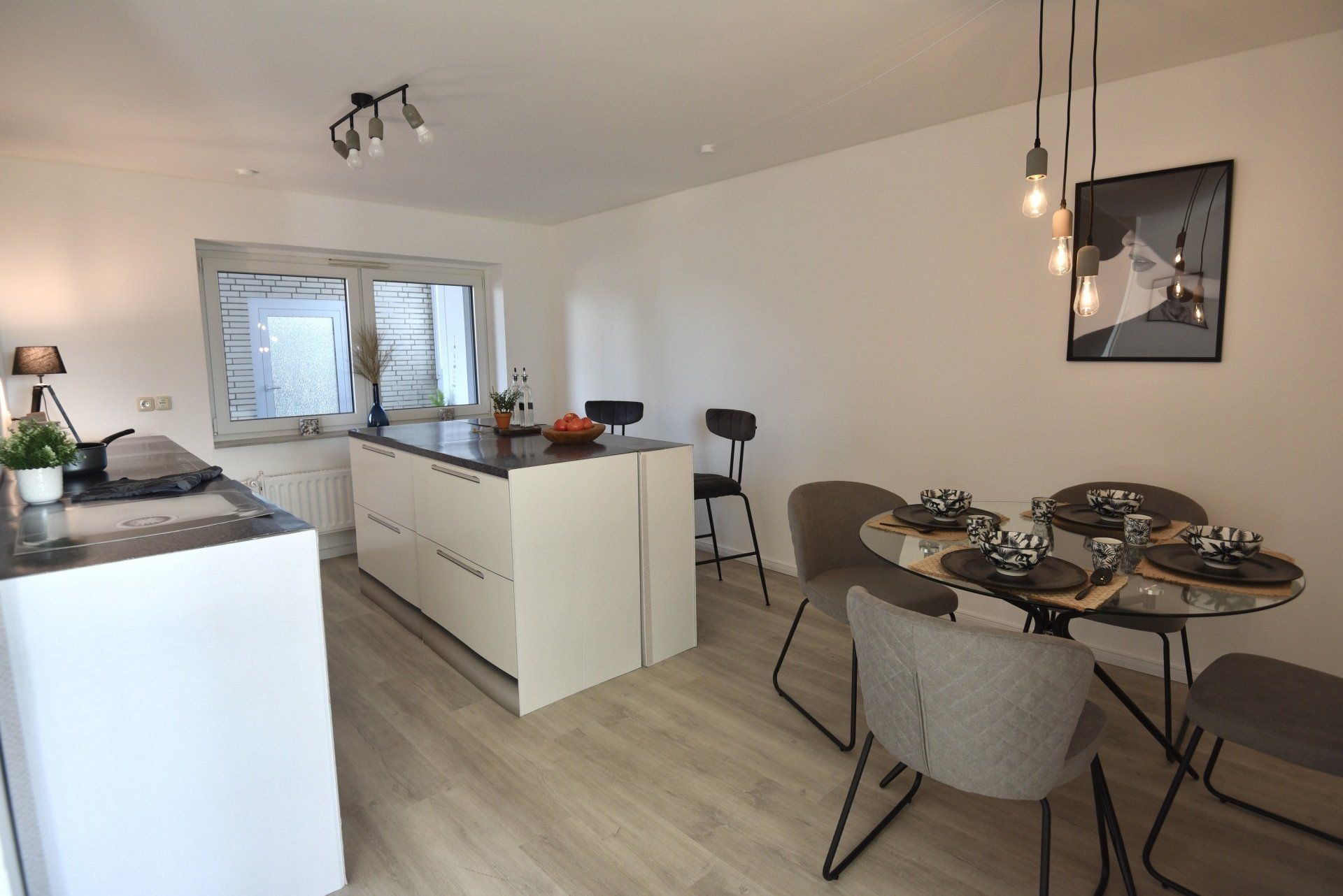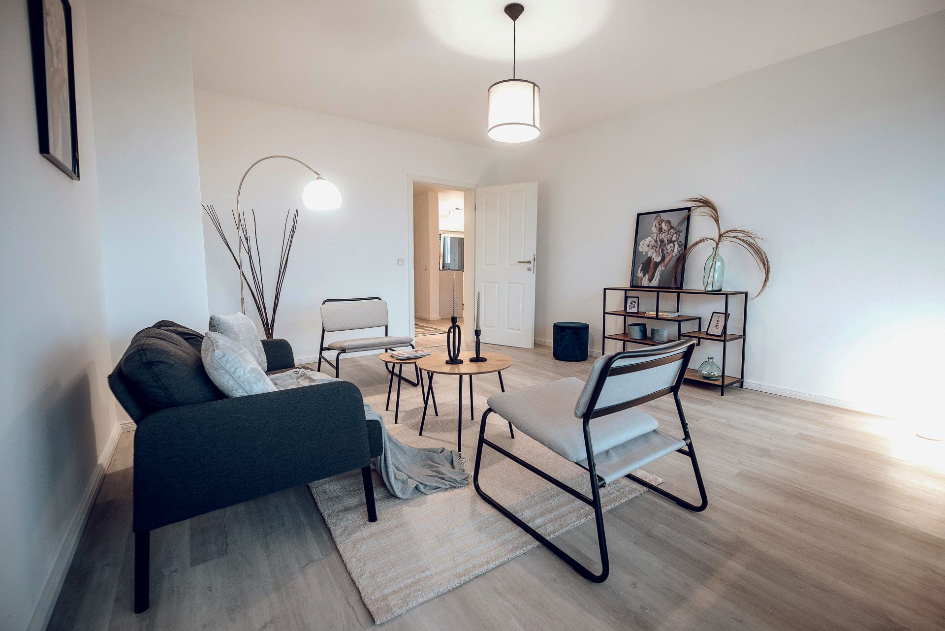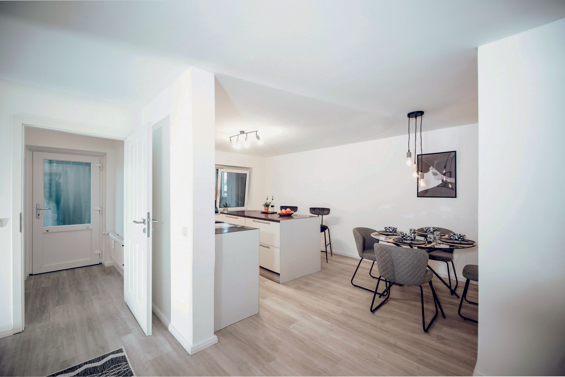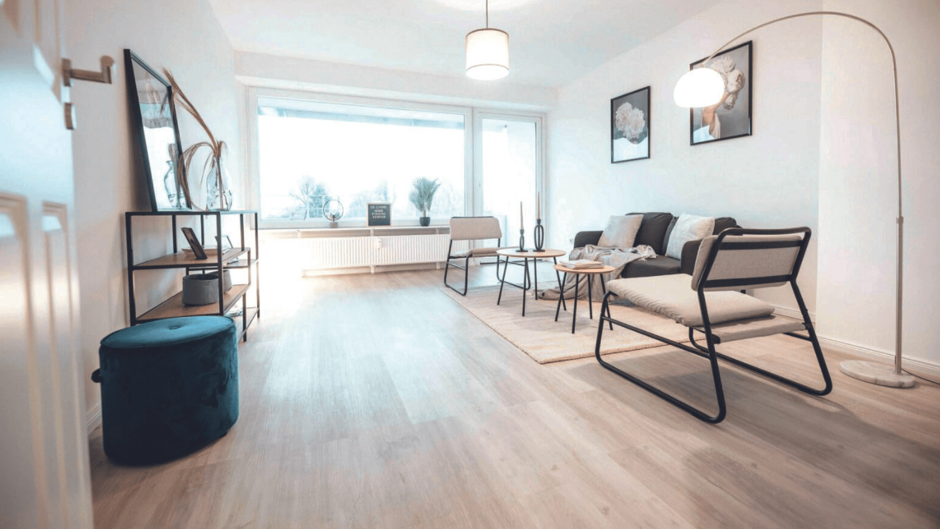 Einfach nur „hyggelig“, anders kann man das City-Appartement nicht beschreiben. Es präsentiert sich im Bestzustand, alle Wände sind fein verputzt und hell gestrichen. Bei der Auswahl der Materialien wurde viel Wert auf höchste Qualität gelegt. Die schönen Innentüren sind weiß gehalten mit Kassettenoptik. Der Boden besteht aus hochwertigen Vinylplanken in einem warmen Holzton und die edlen Fliesen im Badezimmer sind in Natursteinoptik.