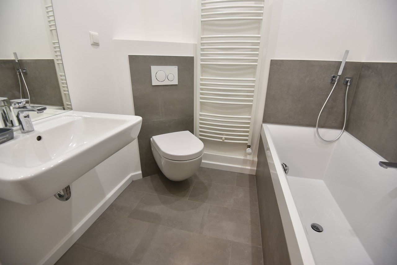 Das neu gestaltete Wannenbad als auch das neue Duschbad mit Rainshower präsentieren sich mit großformatigen Fliesen in Beton-Optik modern und zeitlos. Sämtliche Wände wurden gespachtelt, geschliffen und hell gestrichen, die Böden entweder aufbereitet oder neu verlegt. Die neuen Wohnungsabschluss- als auch Innentüren, Design-Heizkörper und die installierten Downlights unterstreichen das neuwertige Erscheinungsbild.