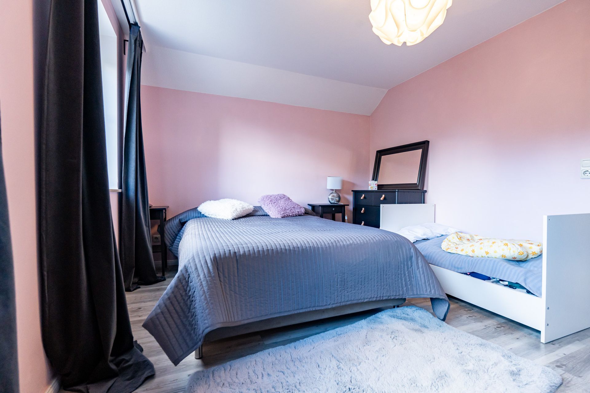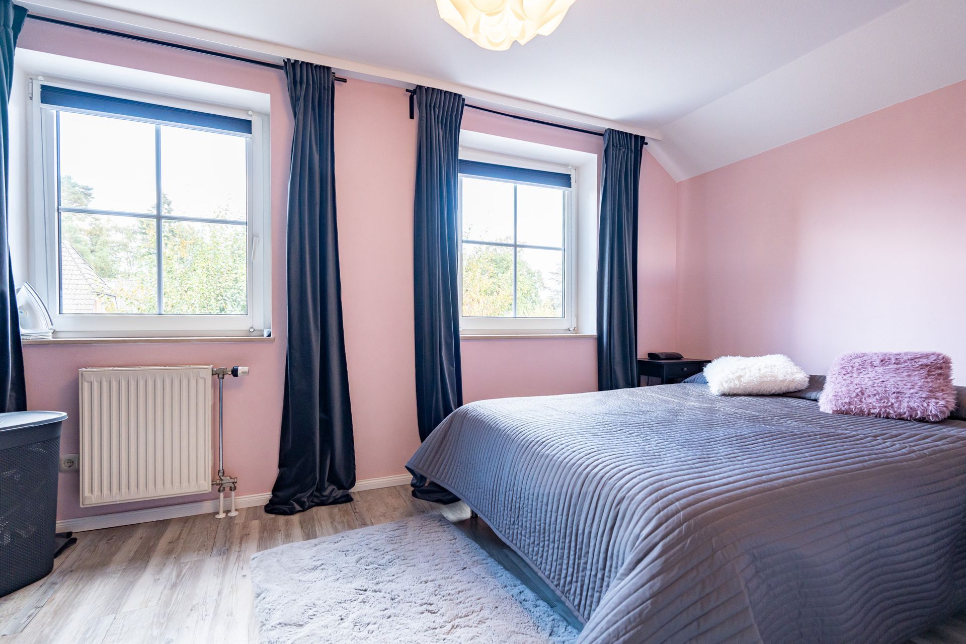 Eine elegante weiße Treppe führt ins Obergeschoss, das mit einem hochwertigen Vinylfußboden in Holzoptik versehen ist. Hier befinden sich ein großes Schlafzimmer, zwei gut geschnittene Kinderzimmer – beide mit Außenrollläden – sowie ein helles Badezimmer mit Badewanne und separater Dusche.