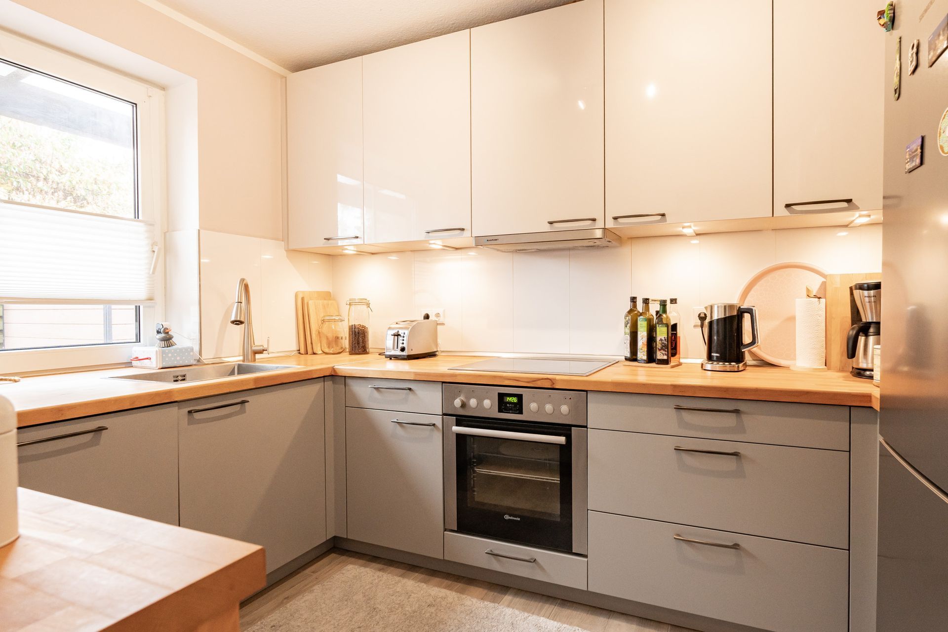 Die moderne, hochwertige Markeneinbauküche aus dem Jahr 2019 überzeugt durch ihre ansprechende Optik und ist mit sämtlichen Markengeräten – Backofen, Cerankochfeld, Geschirrspüler und freistehendem Kühlschrank – ausgestattet.