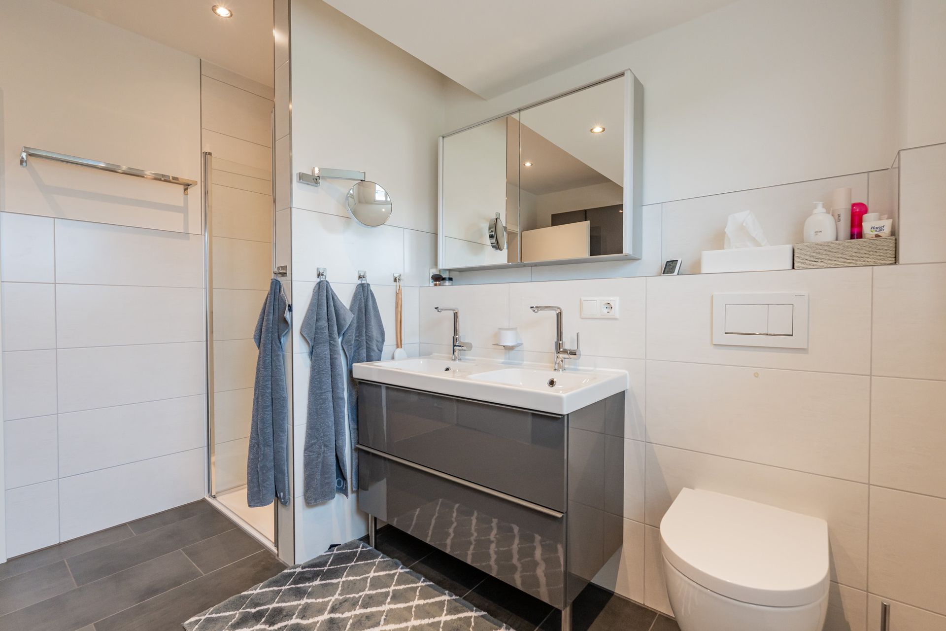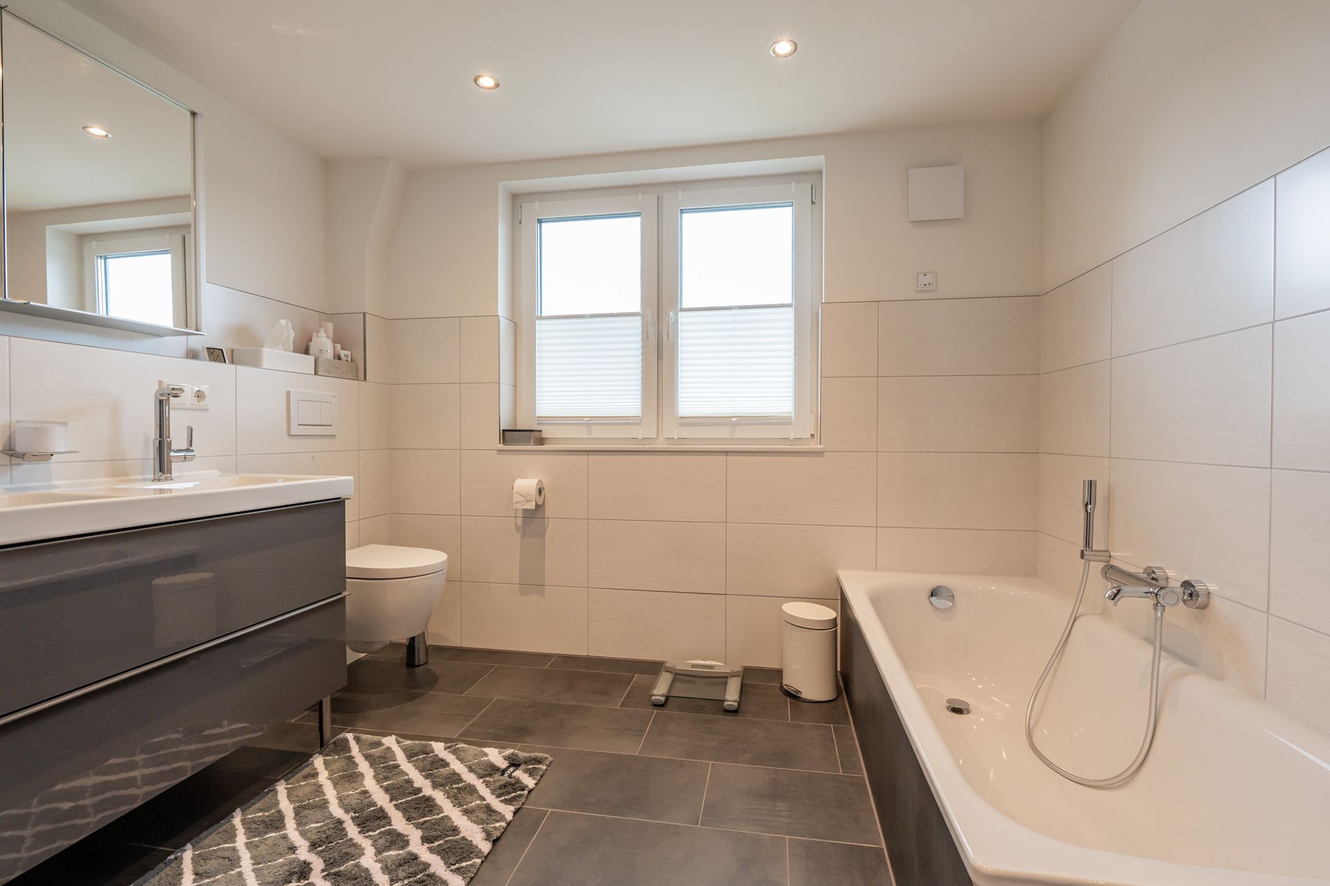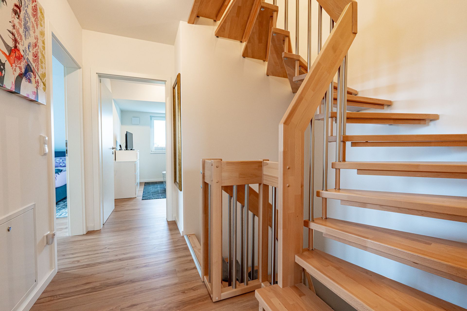 Über eine stilvolle Holztreppe gelangen Sie ins Obergeschoss, das drei optimal geschnittene Schlafzimmer beherbergt – jedes mit TV-Anschluss und Netzwerkverkabelung ausgestattet, um maximale Flexibilität zu bieten. Das großzügige, modern gestaltete Vollbad lässt keine Wünsche offen: eine große Dusche (90x90 cm) mit Glastüren, ein Doppelwaschtisch mit passendem Badezimmerschrank, eine hochwertige Emaille-Badewanne sowie ein feuchtigkeitsgesteuerter Lüfter mit Timerfunktion sorgen für höchsten Komfort.