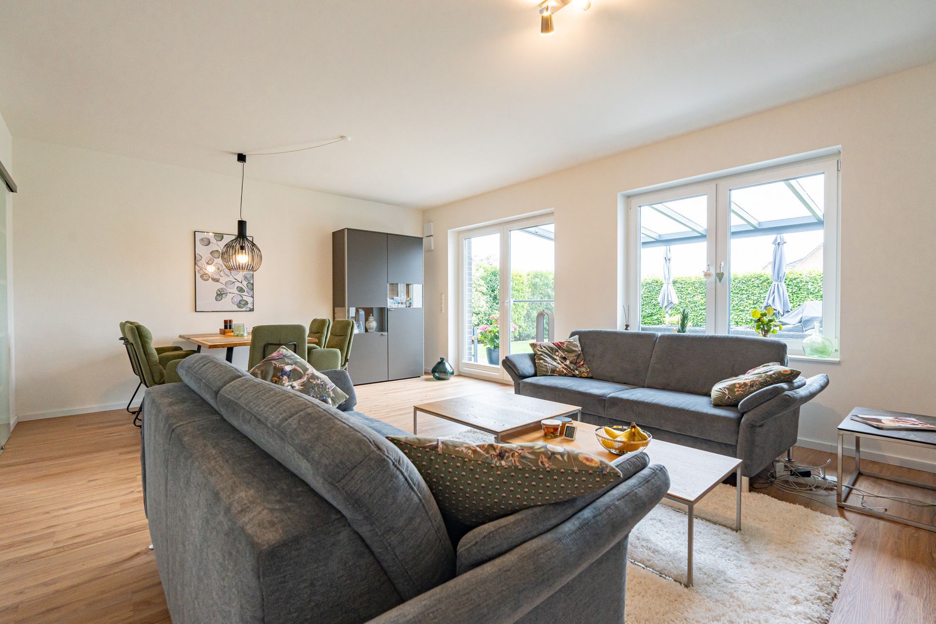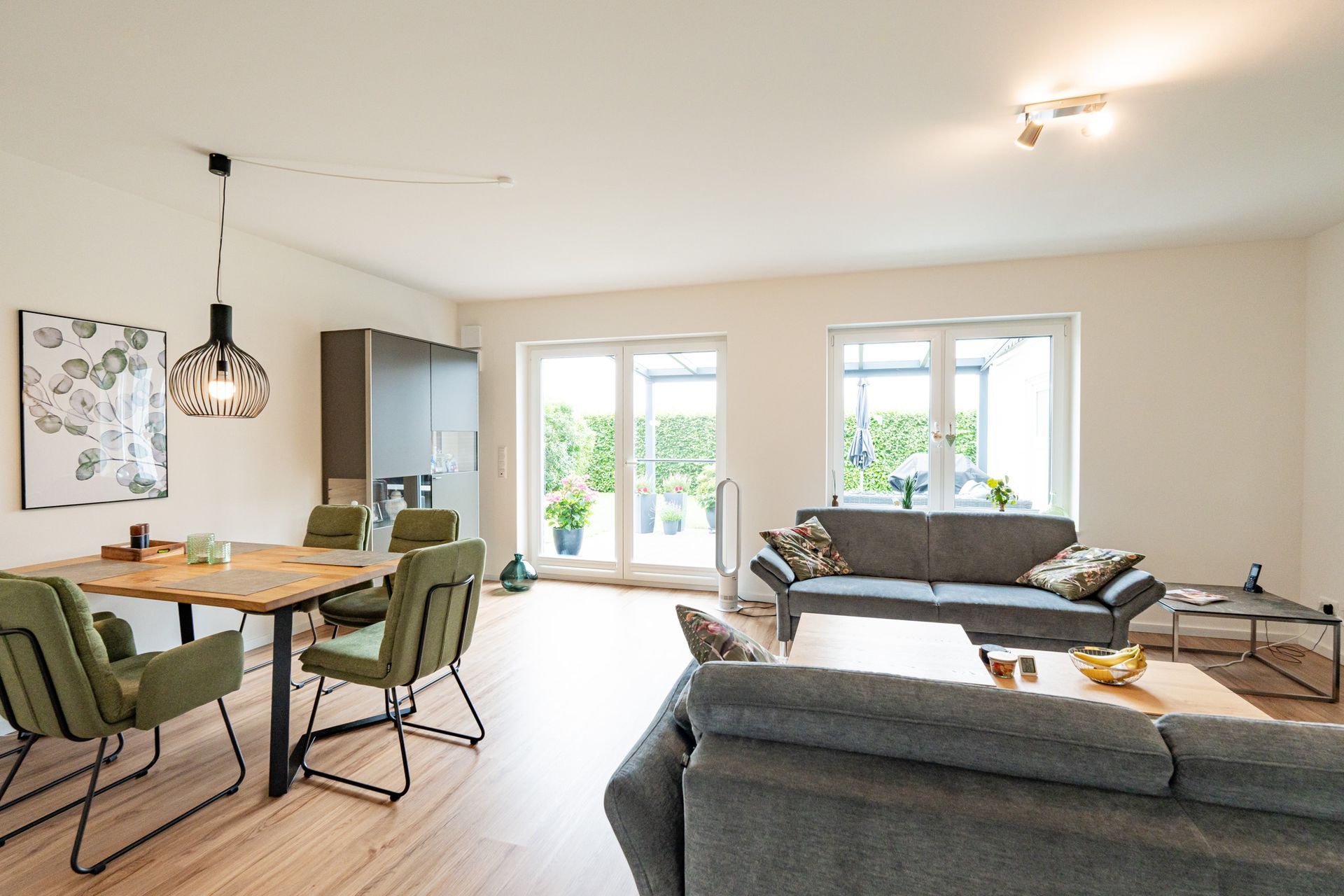 Das Herzstück des Hauses bildet der lichtdurchflutete Wohn- und Essbereich, der mit einem Kaminanschluss für eine behagliche Atmosphäre an kühleren Tagen sorgt.