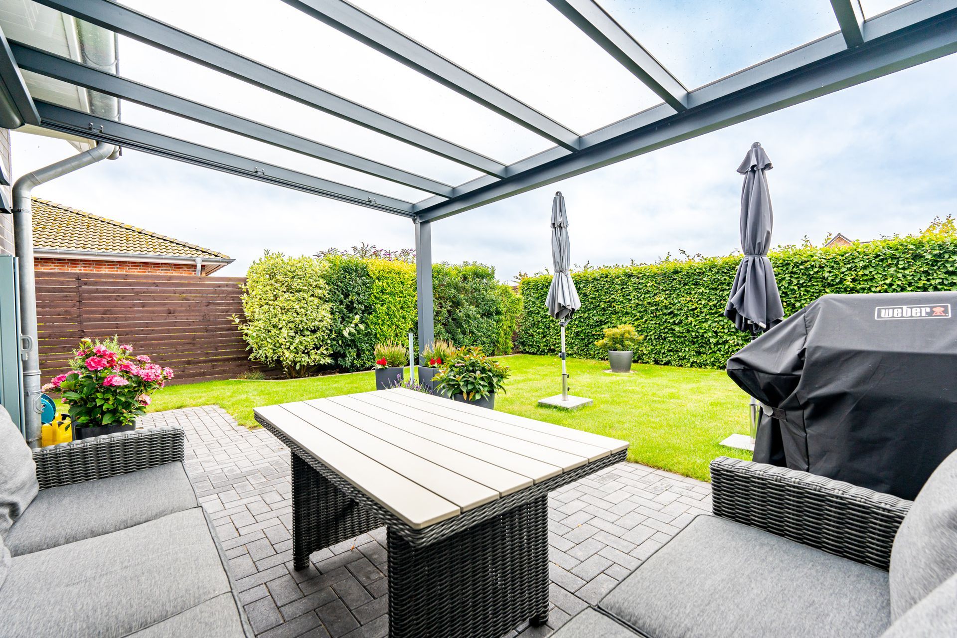 Das ca. 306 m² große, liebevoll angelegte Grundstück ist ein kleines Paradies: Eine großzügige Auffahrt, ein Carport mit praktischem Geräteraum, eine sonnige Terrasse mit hochwertiger Überdachung und ein separater Außenabstellraum schaffen Komfort und Ordnung zugleich.