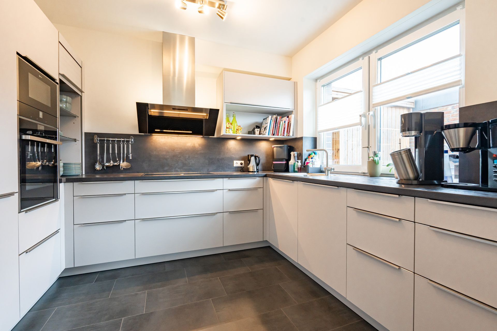 Eine elegante Schiebetür führt direkt in die exklusive Einbauküche der renommierten Firma Häcker. Diese ist mit hochwertigen Markengeräten ausgestattet, darunter ein Cerankochfeld, eine leistungsstarke Dunstabzugshaube, eine Miele Kühl-/Gefrierkombination, Mikrowelle, Backofen in ergonomischer Arbeitshöhe sowie ein Geschirrspüler – ideal für alle, die Kochen lieben. Im gesamten Erdgeschoss schafft ein edler Vinylboden in Holzoptik eine warme Wohnatmosphäre, während Fußbodenheizung und eine dezentrale Lüftungsanlage mit Wärmerückgewinnung im Erd- und Obergeschoss für ein angenehmes Raumklima sorgen. Vom Wohnbereich aus treten Sie direkt hinaus auf die überdachte Terrasse mit Echtglasdach und automatischer Beschattung – ein traumhafter Platz für entspannte Stunden im Freien zu jeder Jahreszeit.