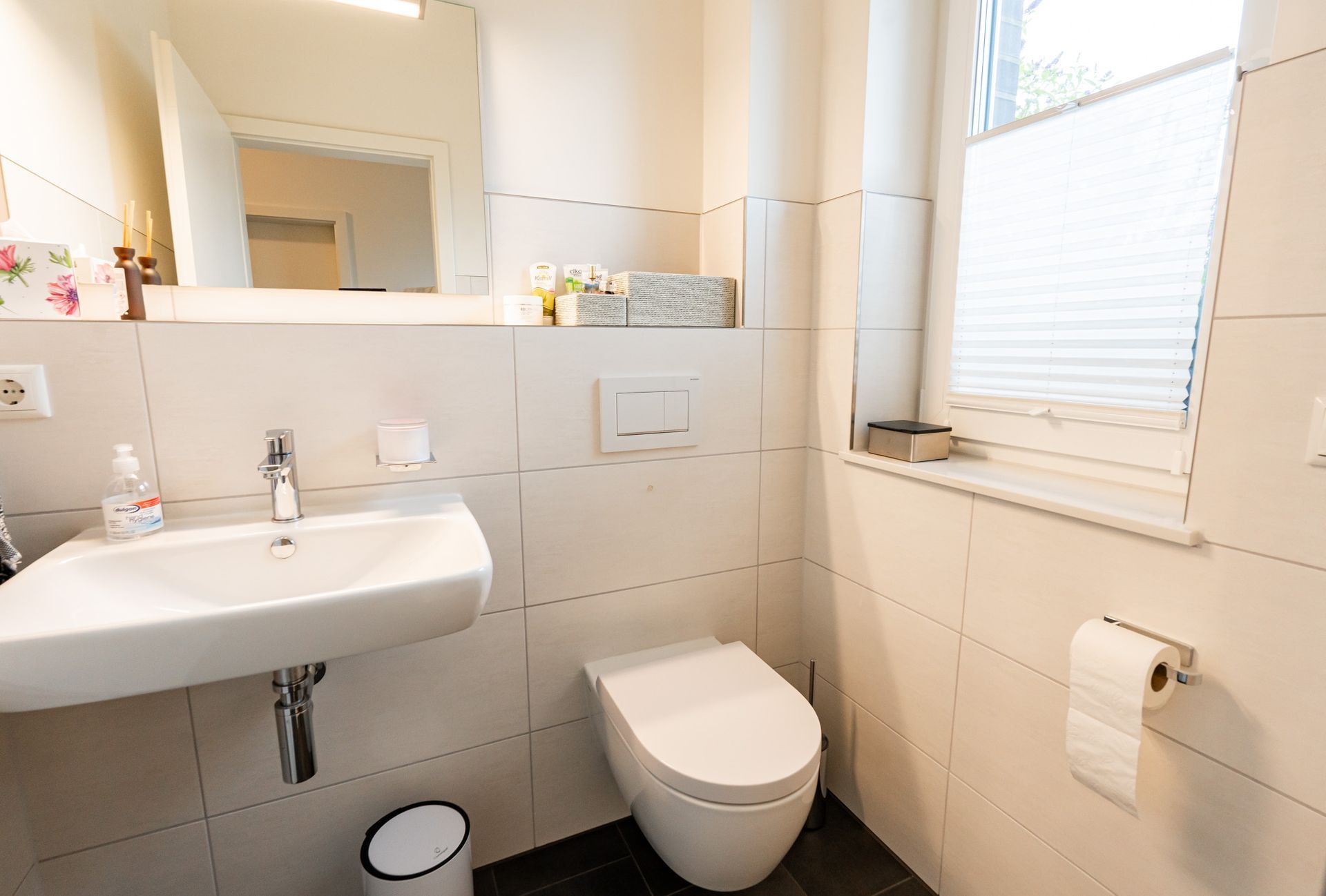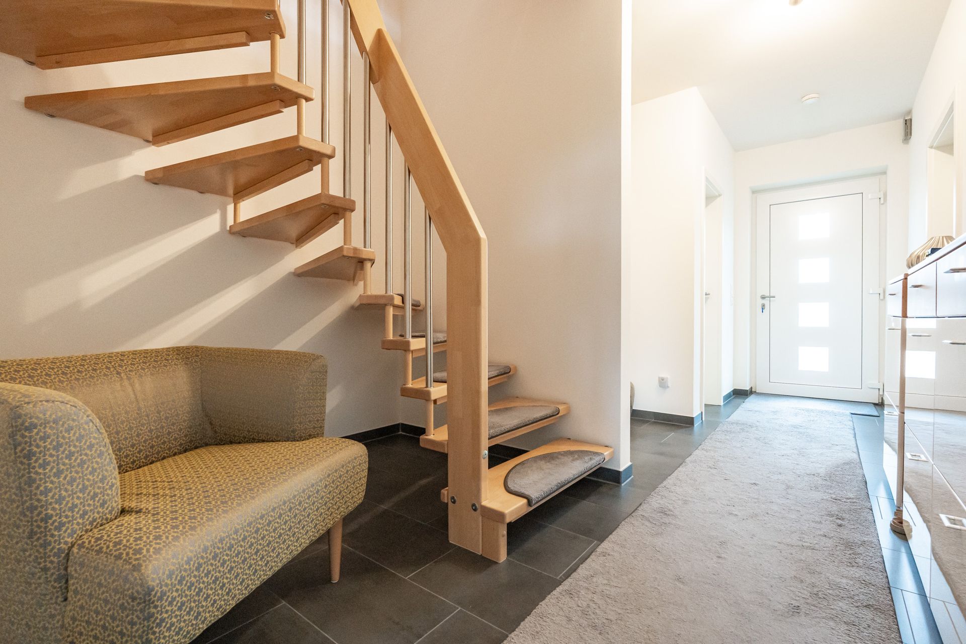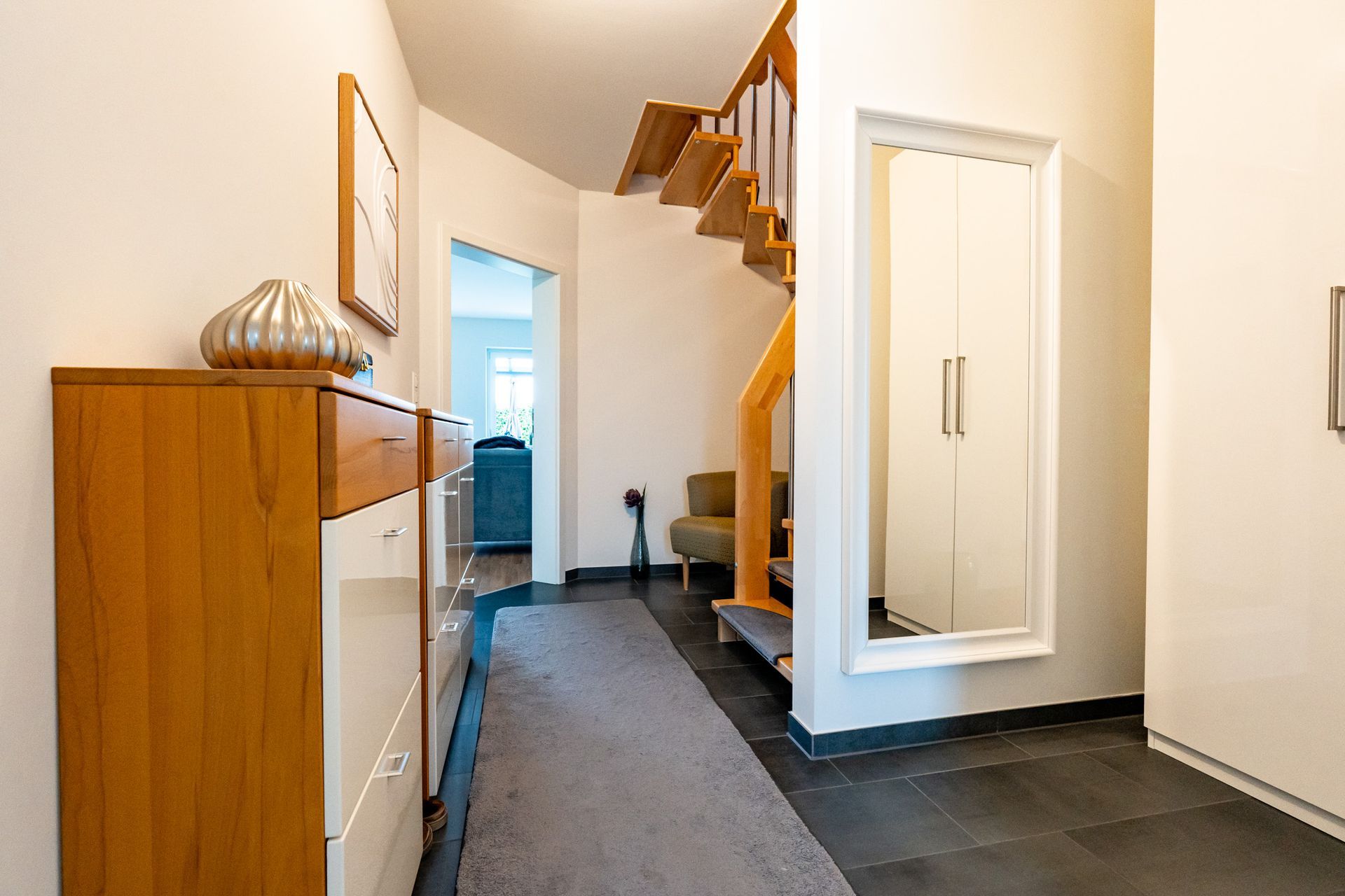 Im Erdgeschoss werden Sie von einem großzügigen Eingangsbereich empfangen, der mit einer praktischen Nische für Garderobe oder Abstellmöglichkeiten überzeugt – perfekt, um Schuhe, Jacken und Alltagsgegenstände ordentlich zu verstauen. Ebenso ist ein stilvolles Gäste-WC vorhanden.