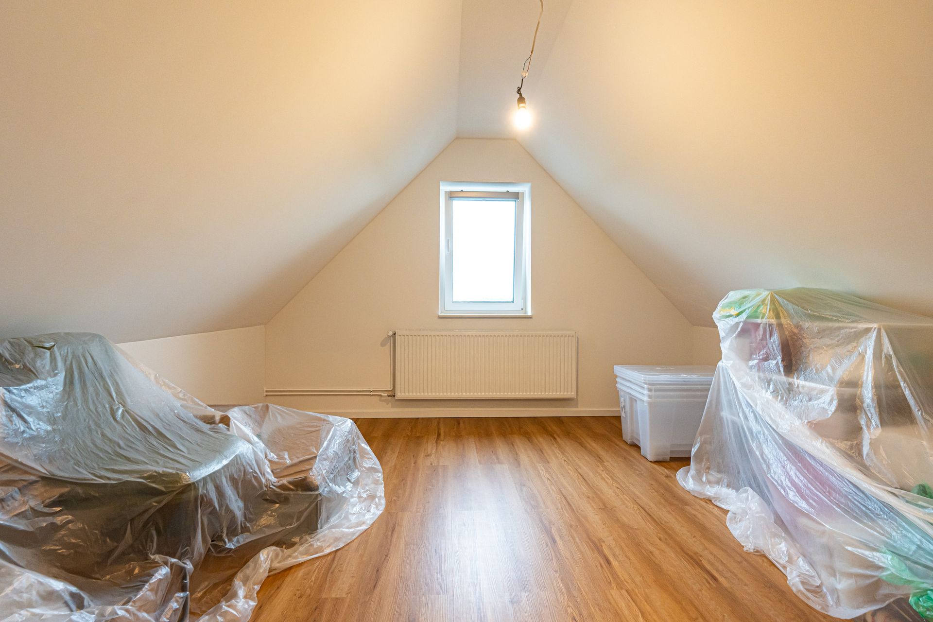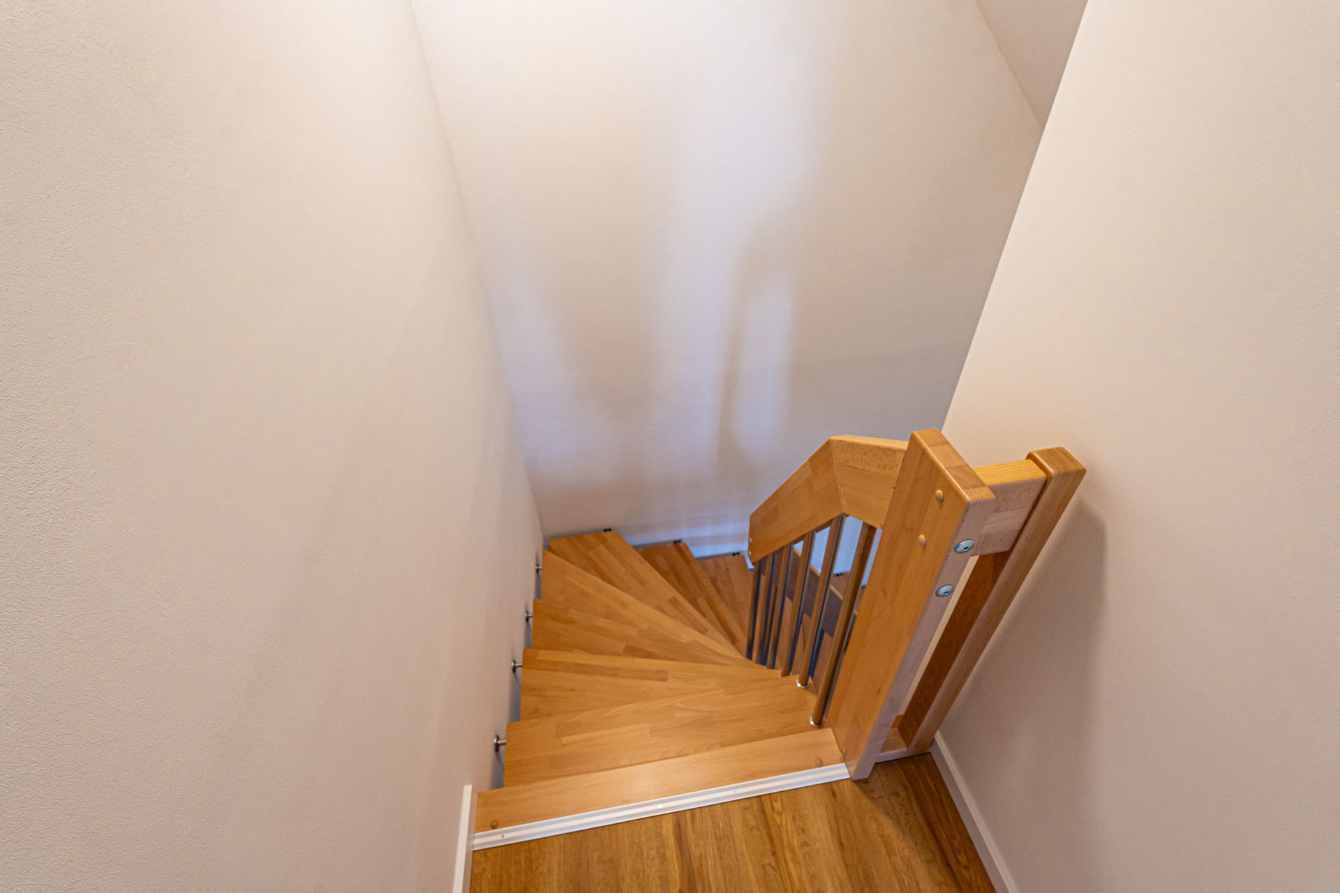 Eine weitere Holztreppe führt in den ausgebauten Spitzboden. Dieser helle, beheizbare Raum bietet rund 13 m² Nutzfläche und eignet sich ideal als Homeoffice, Gästezimmer oder kreativer Rückzugsort.