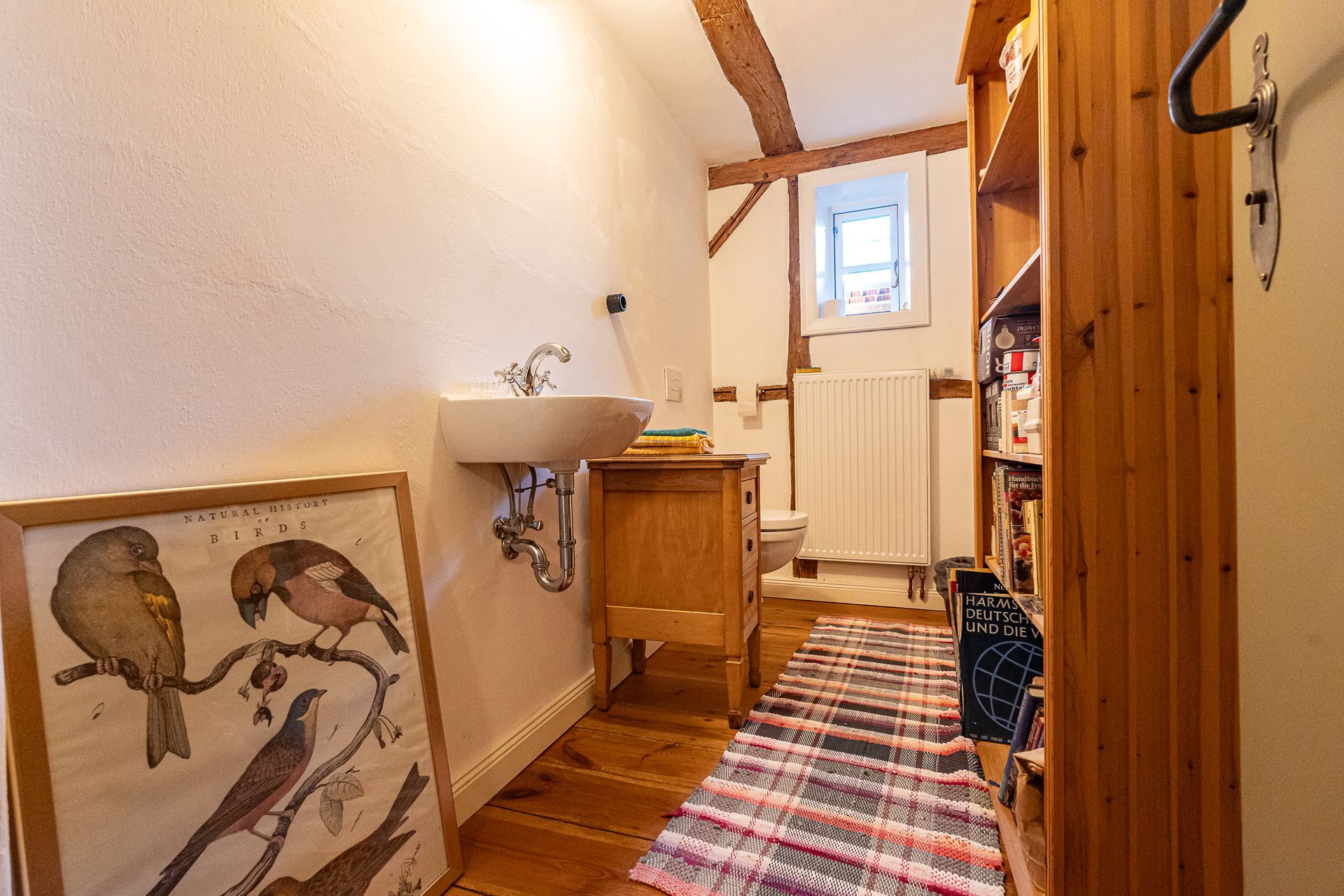 Zusätzlich verfügt das Haus über ein Gäste-WC, ein Büro-/Gästezimmer, ein Ankleidezimmer sowie ein großzügiges Schlafzimmer mit historischen Holzdielen und ein Giebelzimmer. Im Büro sowie im Giebelzimmer besteht ebenfalls die Möglichkeit einen Ofen anzuschließen (etwaige Genehmigungen sind bei der zuständigen Stelle einzuholen).