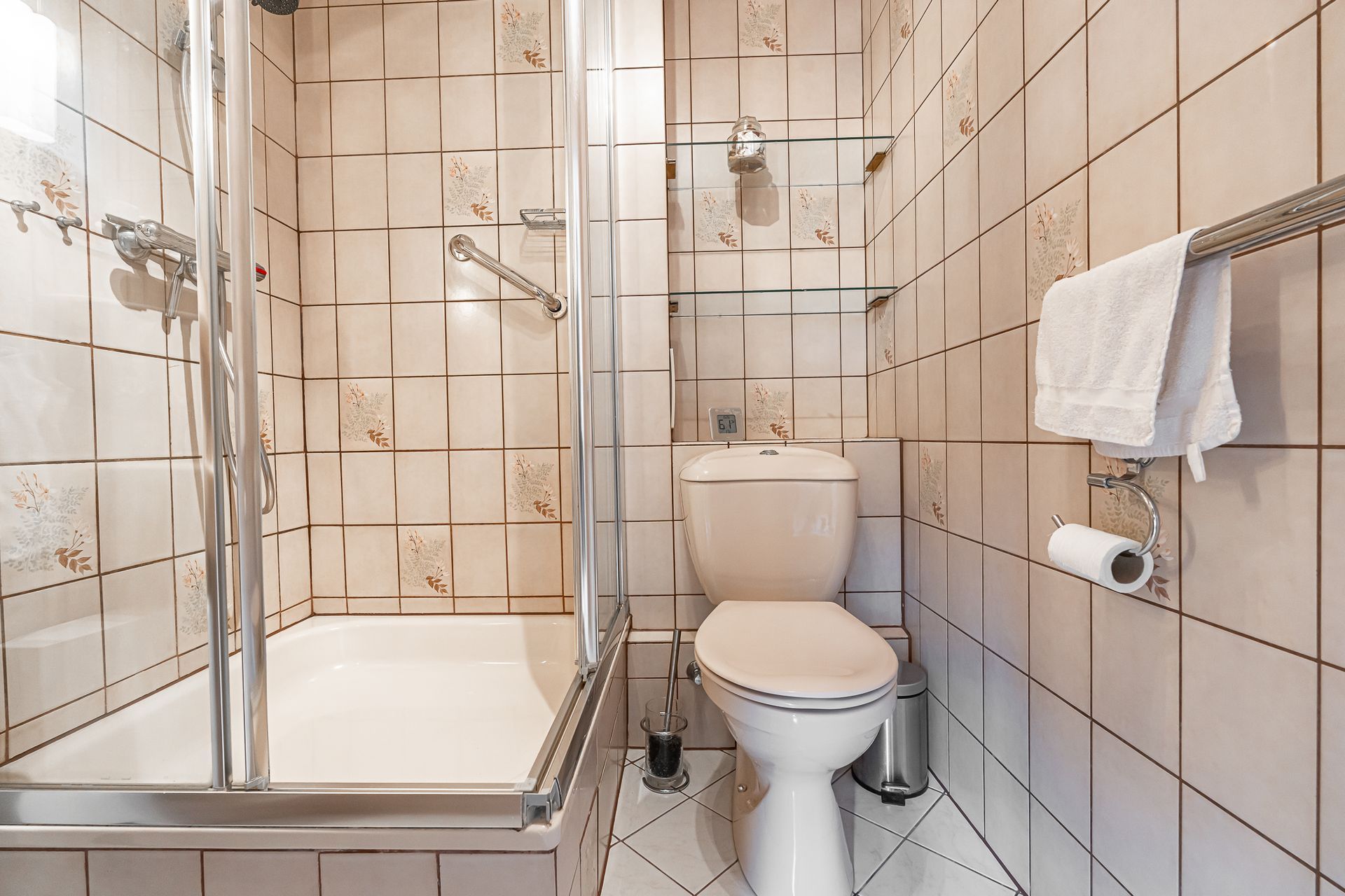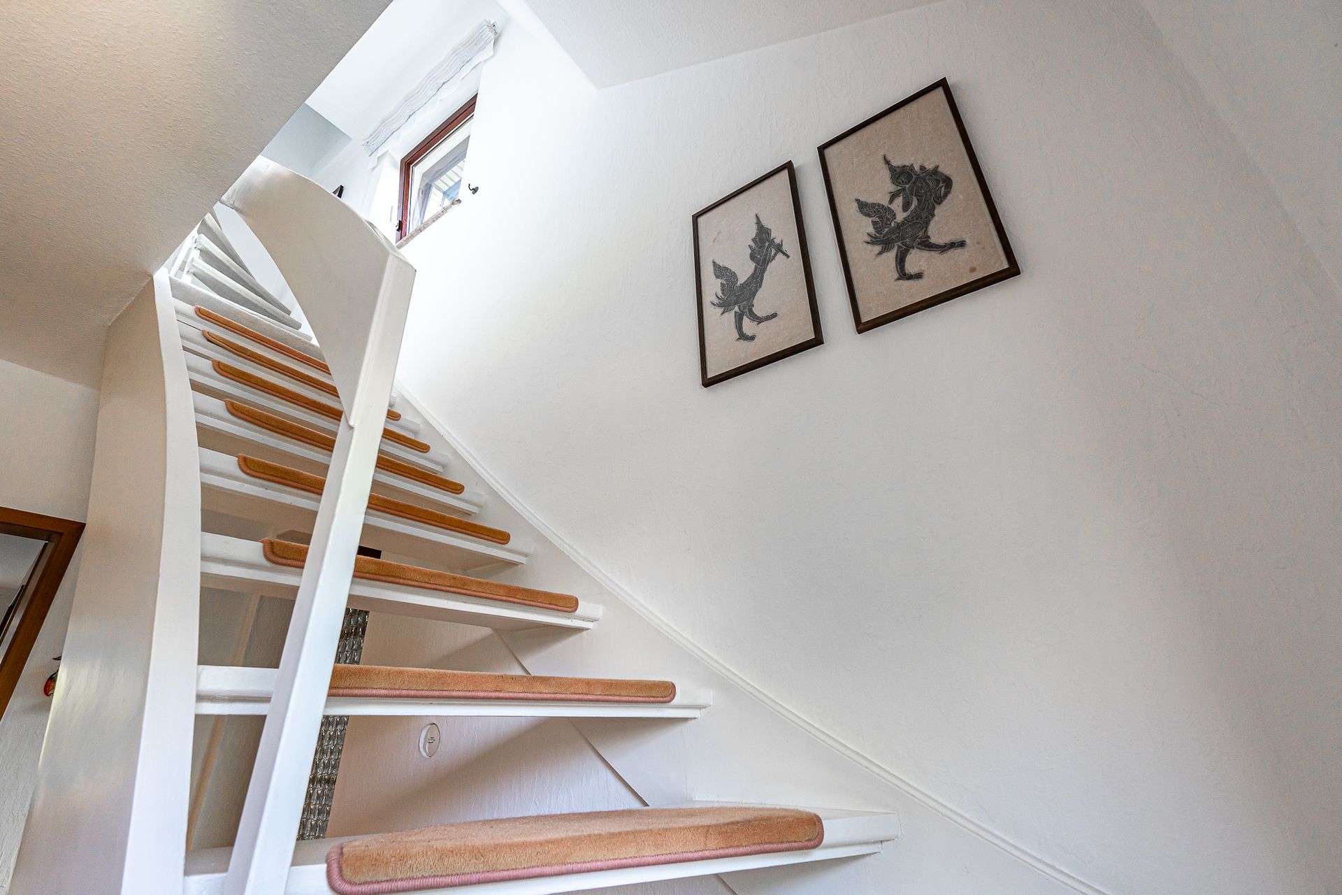 Über eine elegante, weiße Holztreppe gelangen Sie ins Obergeschoss. Dort befinden sich zwei gut geschnittene Zimmer, die viel Platz für individuelle Gestaltung bieten. Eine Dachterrasse lädt zum Entspannen ein und sorgt für zusätzliche Freiräume. Das Badezimmer ist mit einer Dusche ausgestattet.