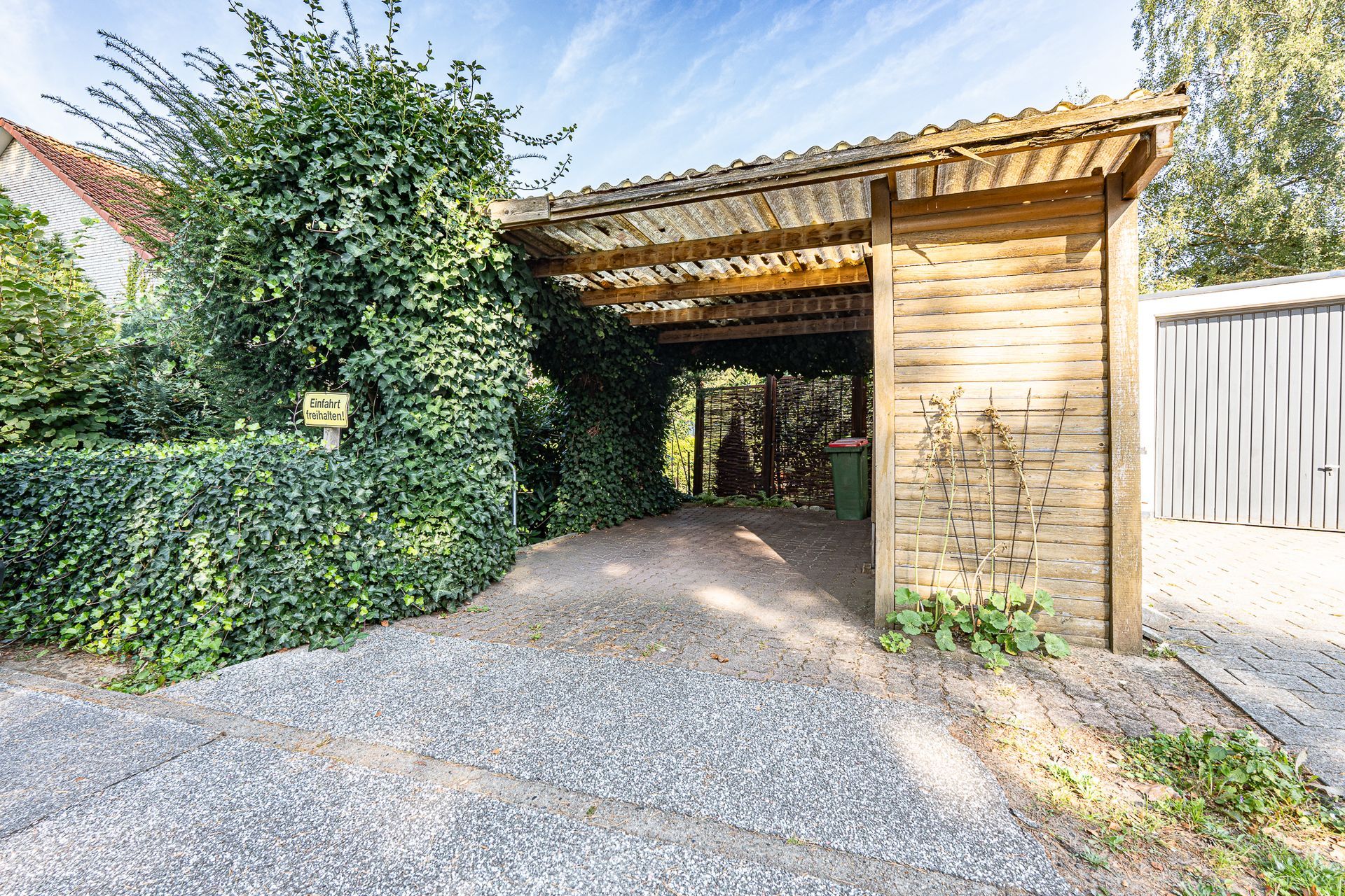 Ein Carport mit angrenzendem Geräteraum sorgt für zusätzlichen Stauraum.
