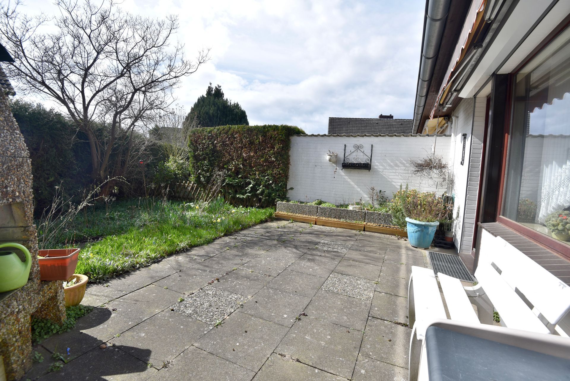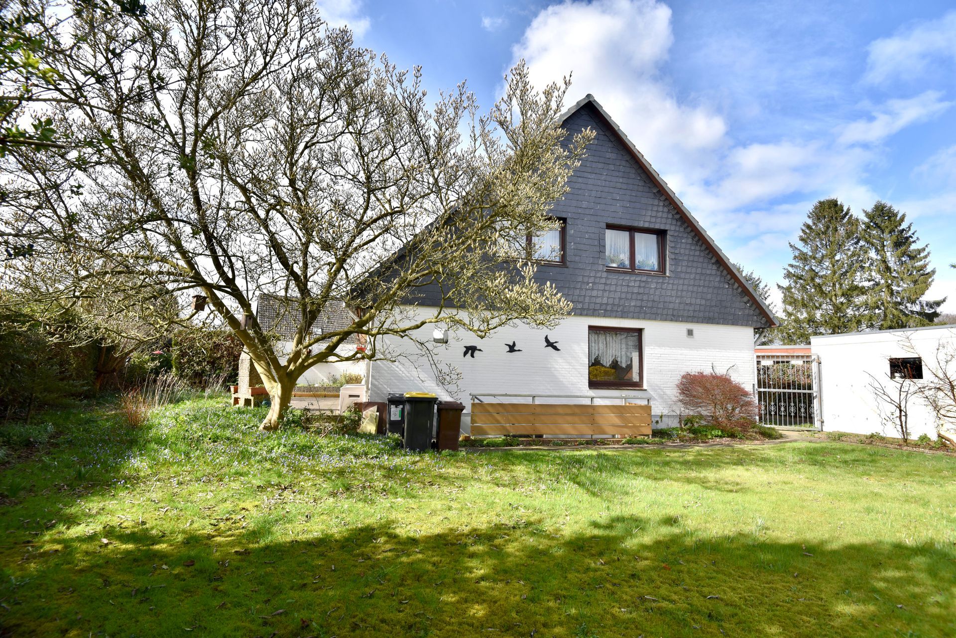 Das Grundstück ist liebevoll angelegt und blickgeschützt eingewachsen. Es gibt eine große Rasenfläche sowie eine Garage und eine Terrasse.