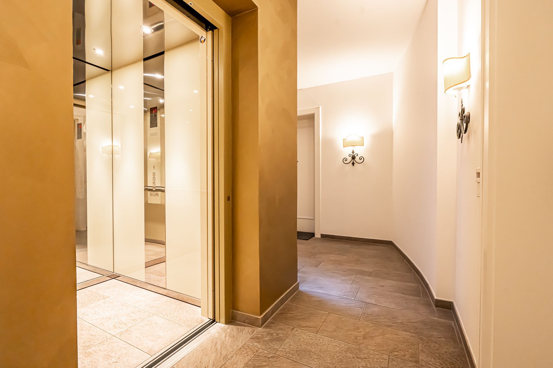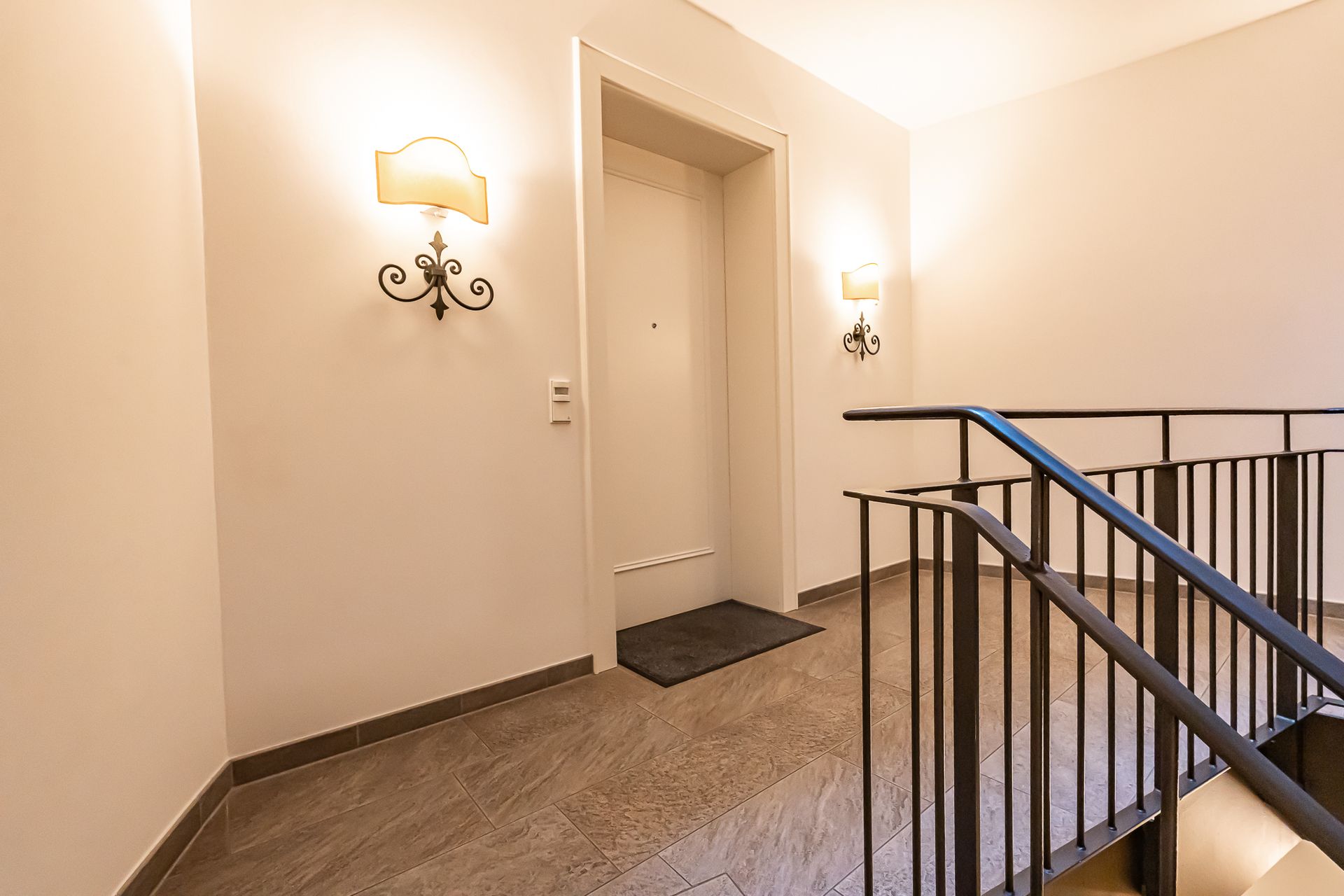 Bereits beim Betreten des stilvollen Entrées offenbart sich die außergewöhnliche Exklusivität dieses Anwesens. Bronzefarbene Klingelschilder und Türgriffe, eine edle Briefkastenanlage im Hausflur sowie geschmiedete Design-Flurleuchten mit Bewegungsmeldern schaffen eine luxuriöse Atmosphäre. Eine Lichtkuppel im Dachgeschoss sorgt zusätzlich für eine sanfte, natürliche Belichtung. Der hochwertige Lift führt Sie direkt in das 1. Obergeschoss, wo sich die Wohnung über die gesamte linke Villenseite erstreckt.