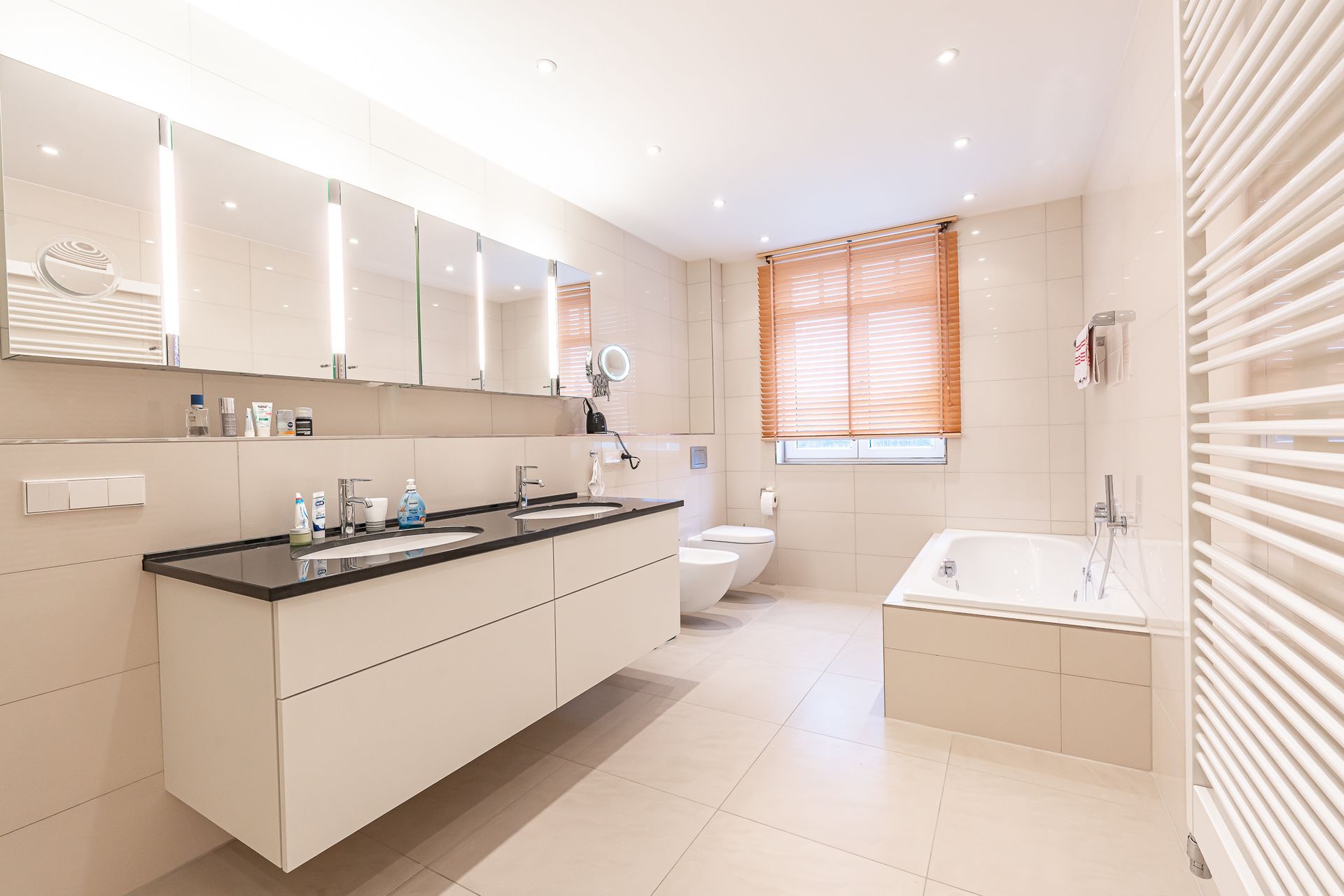 Zusätzlich zum Hauptbadezimmer verfügt die Wohnung über ein modernes Duschbad mit Doppelwaschtisch und Bidet. Zwei weitere Räume bieten vielseitige Nutzungsmöglichkeiten als Schlaf-, Gäste- oder Arbeitszimmer.