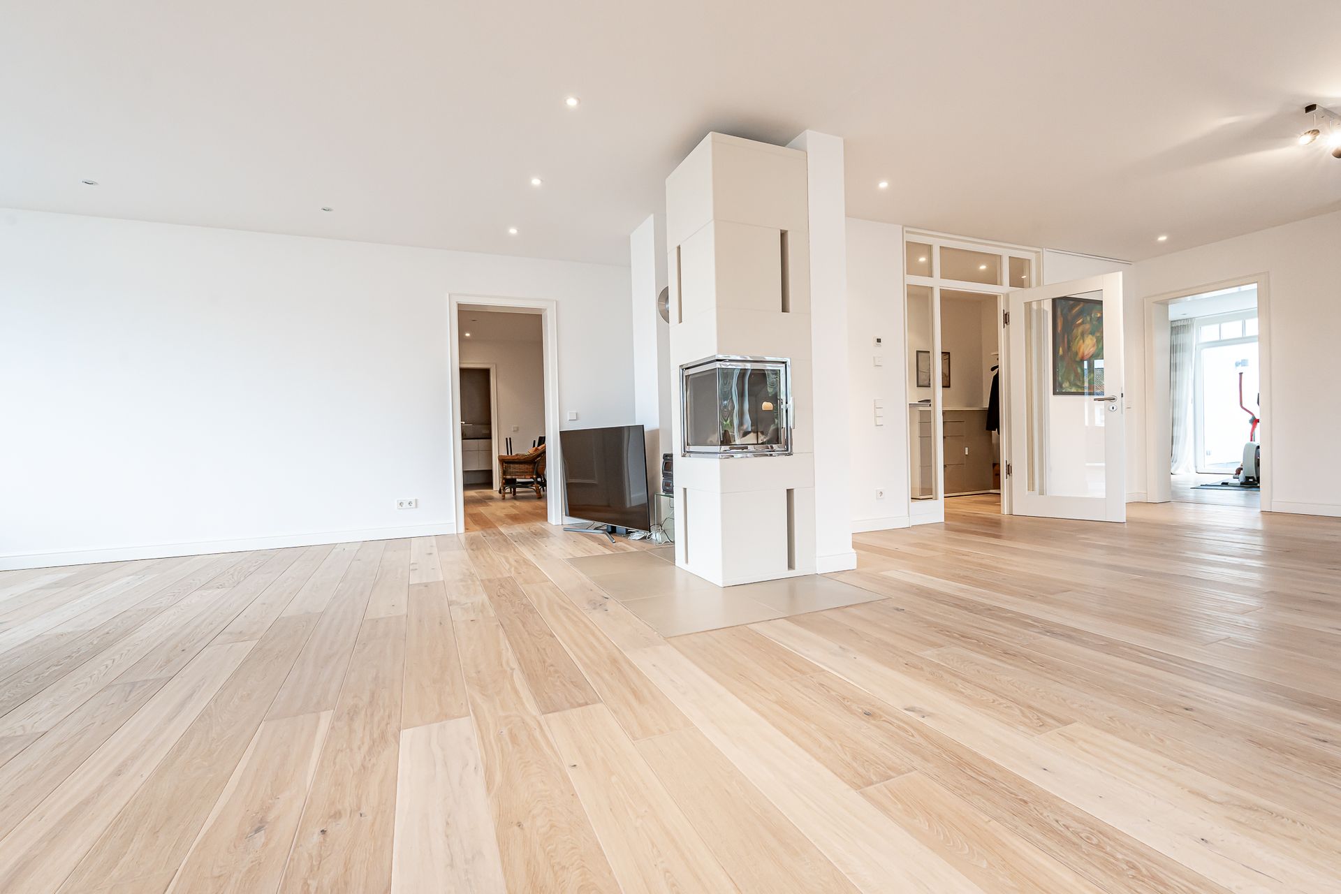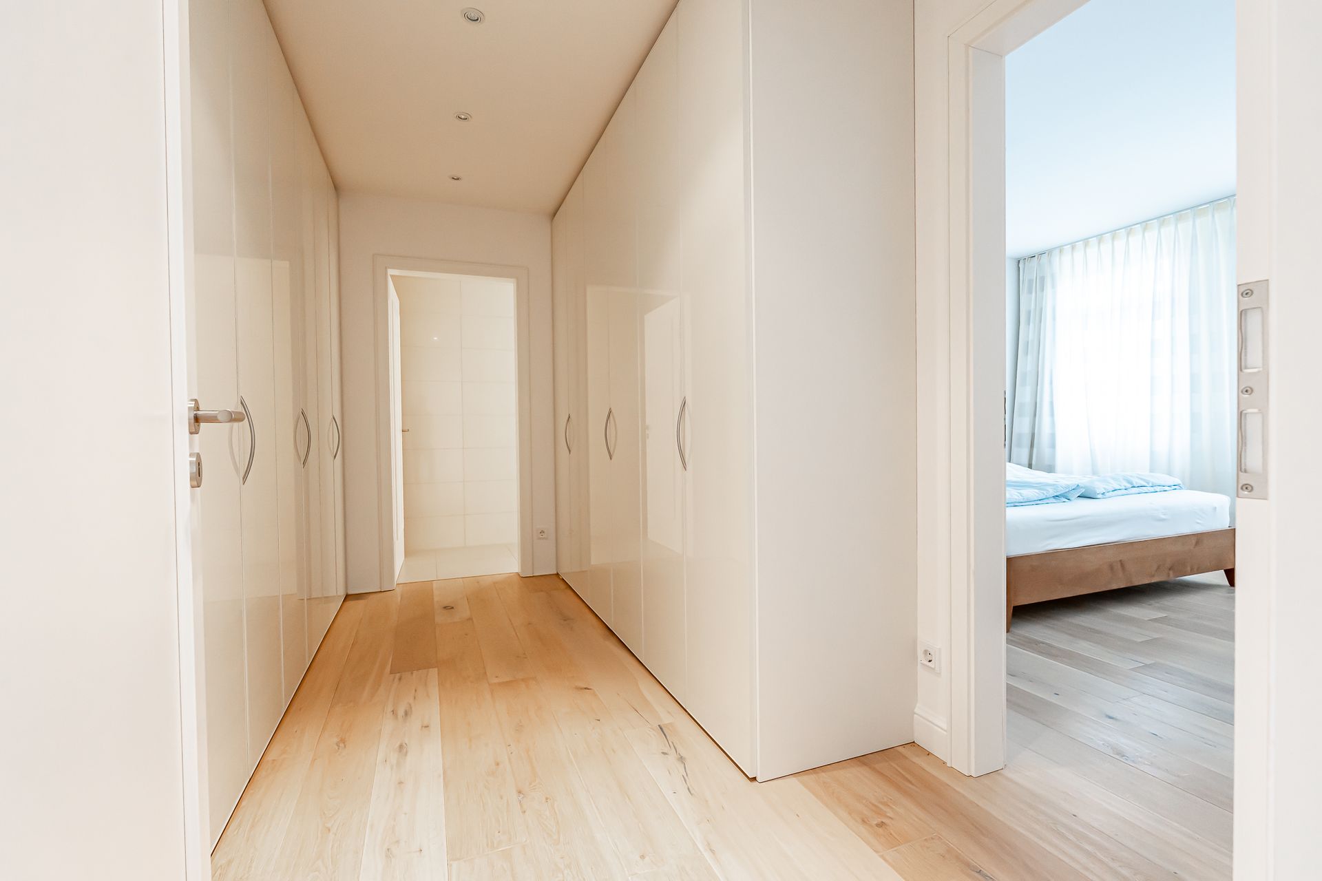 Weiße Stiltüren, integrierte Downlights sowie maßgefertigte Hülsta-Einbauschränke unterstreichen den luxuriösen Wohncharakter und bieten ein durchdachtes, harmonisches Designkonzept.