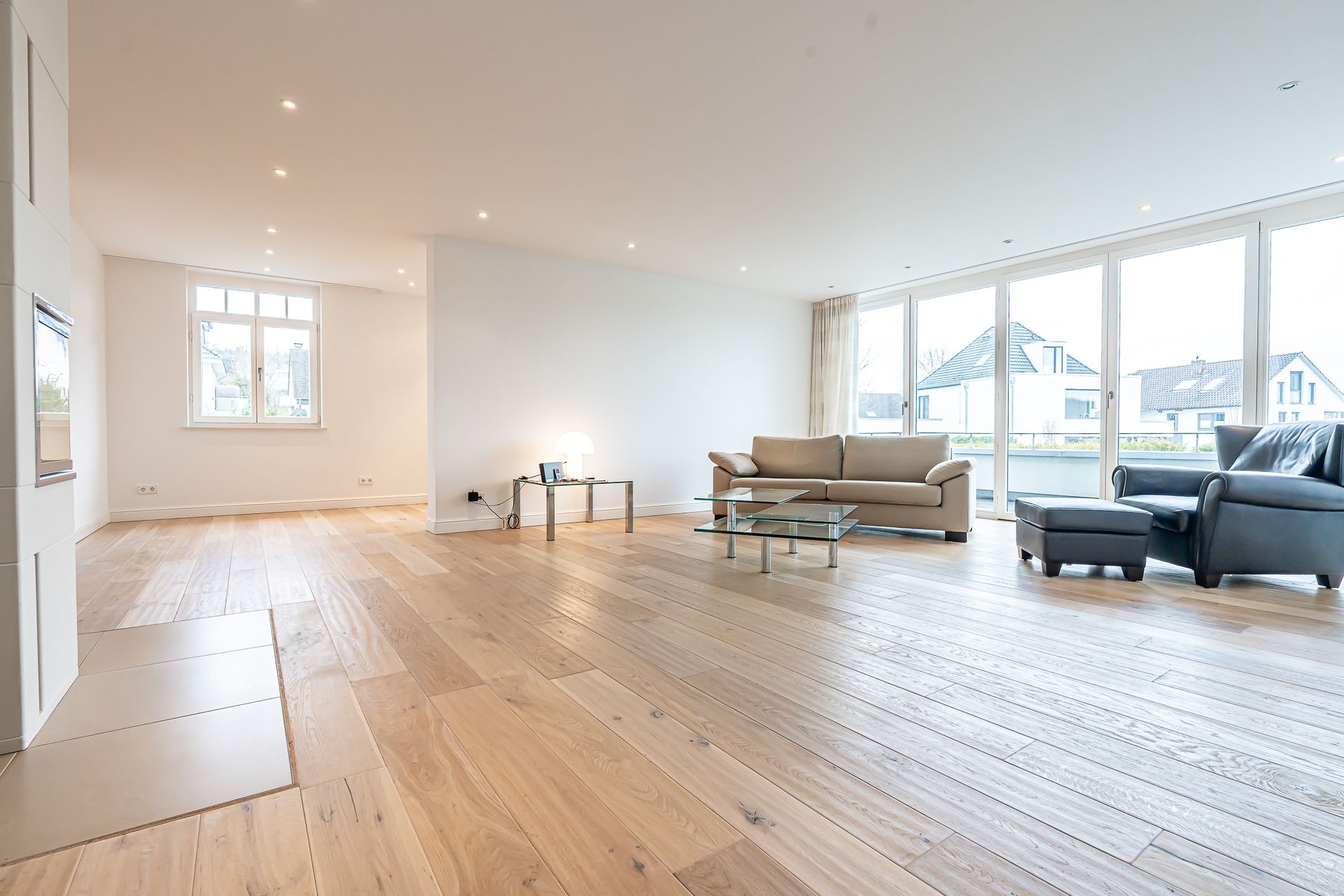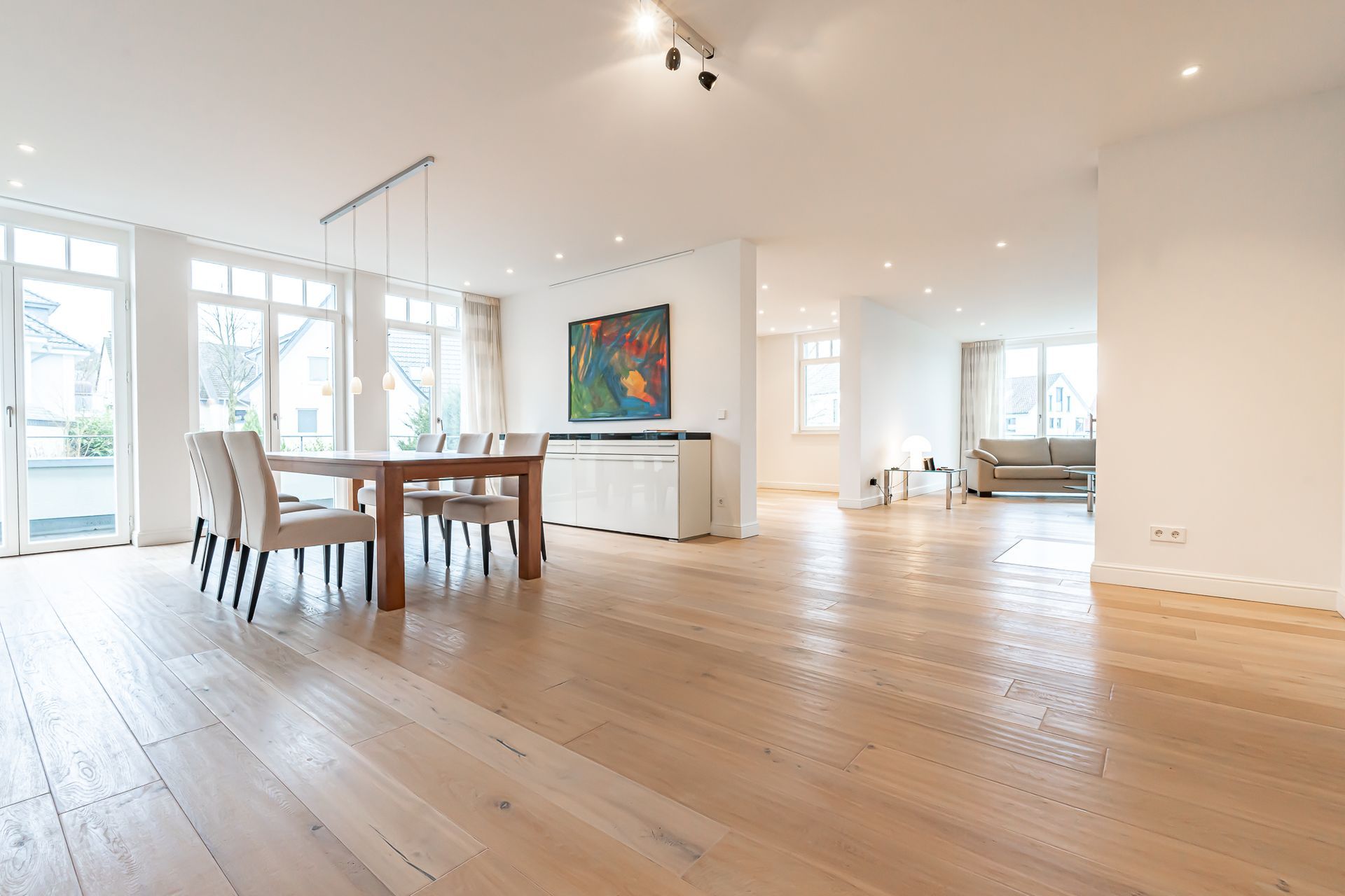 Der hochwertige, handgeschliffene und weiß pigmentierte Eichenparkettfußboden verleiht den Räumen eine edle und warme Atmosphäre, während die komfortable Fußbodenheizung für wohlige Wärme sorgt. Moderne Holzfenster mit Außenrollläden garantieren optimalen Wärme- und Schallschutz.