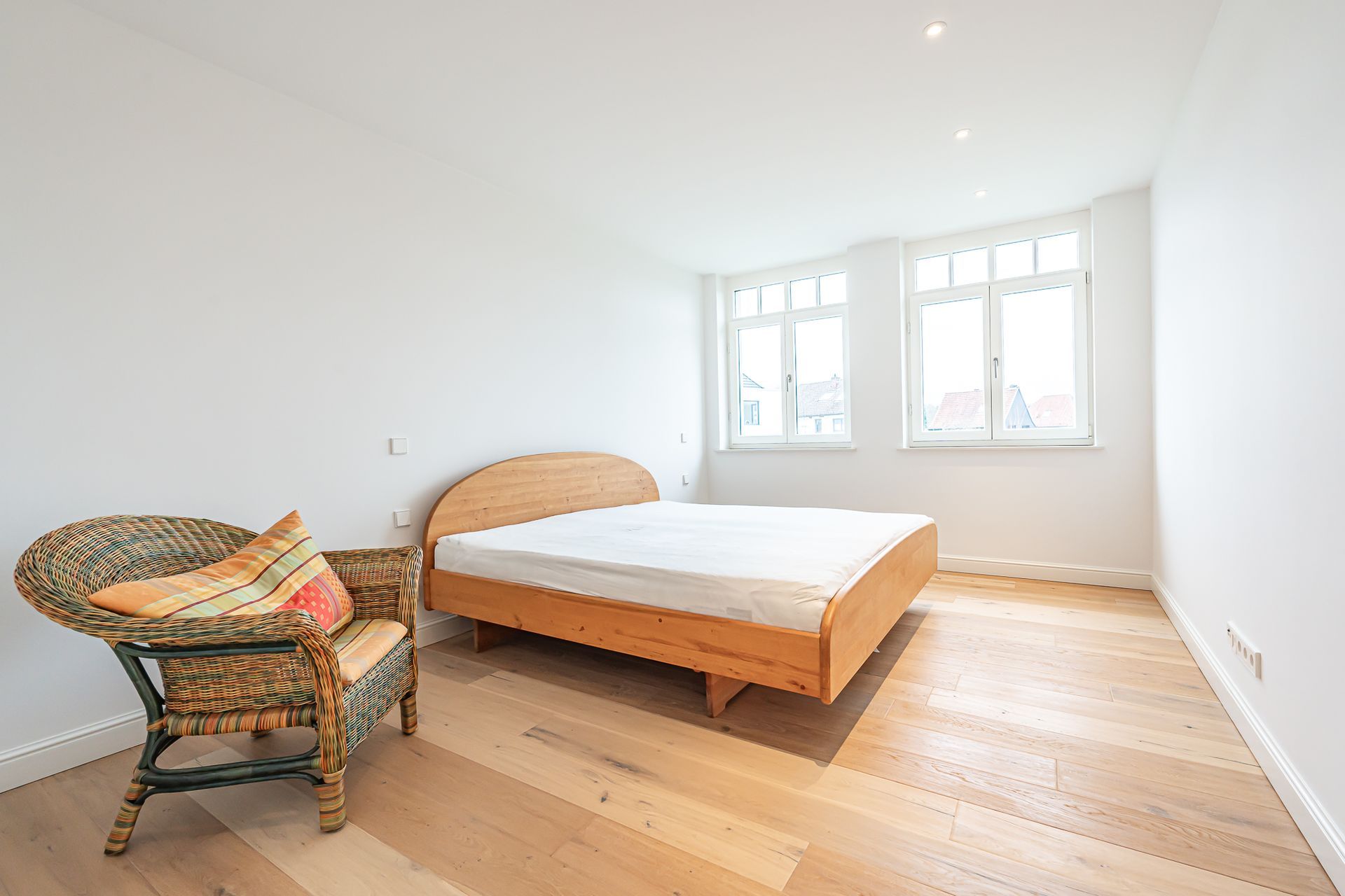 Der private Bereich der Wohnung überzeugt mit einem großzügigen Schlafzimmer, das nahtlos in eine maßgefertigte Ankleide mit deckenhohen Hülsta-Schränken übergeht. Dezente LED-Nachtbeleuchtung in den Steckdosen setzt elegante Lichtakzente. Das angrenzende luxuriöse Vollbad gleicht einer Wellness-Oase: eine begehbare Regendusche mit Schwalldusche, eine Whirlpoolbadewanne, Doppelwaschtische, ein Bidet, ein Handtuchtrockner sowie ein in die Steckdose integriertes Radio sorgen für höchsten Komfort. Ein angrenzendes Fitnesszimmer mit Einbauschränken und Zugang zu einem dritten Balkon rundet diesen exklusiven Bereich ab.