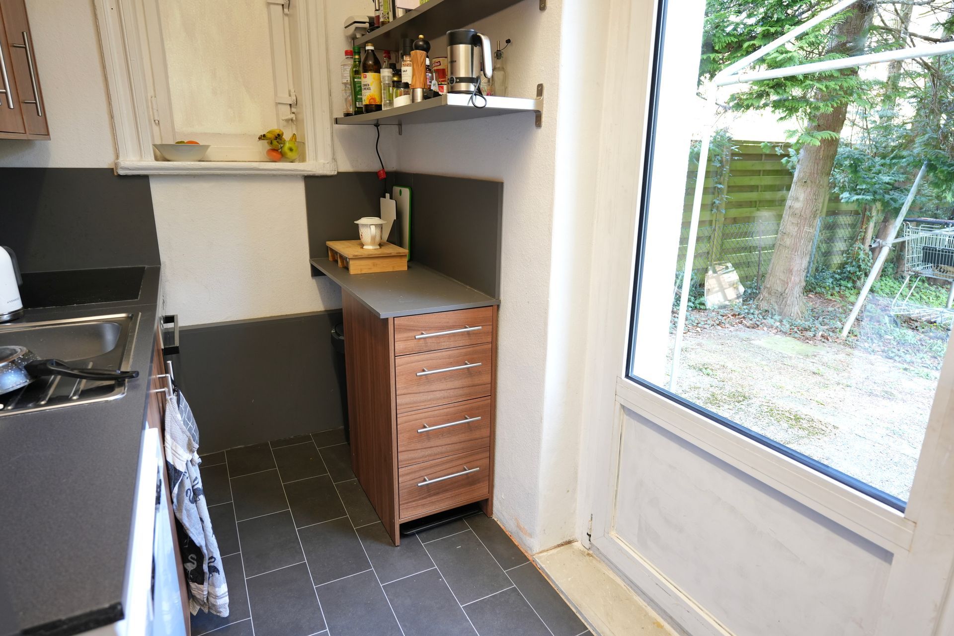 Die Einbauküche bietet einen Ausgang in den Garten und auf die Terrasse. Das Badezimmer ist