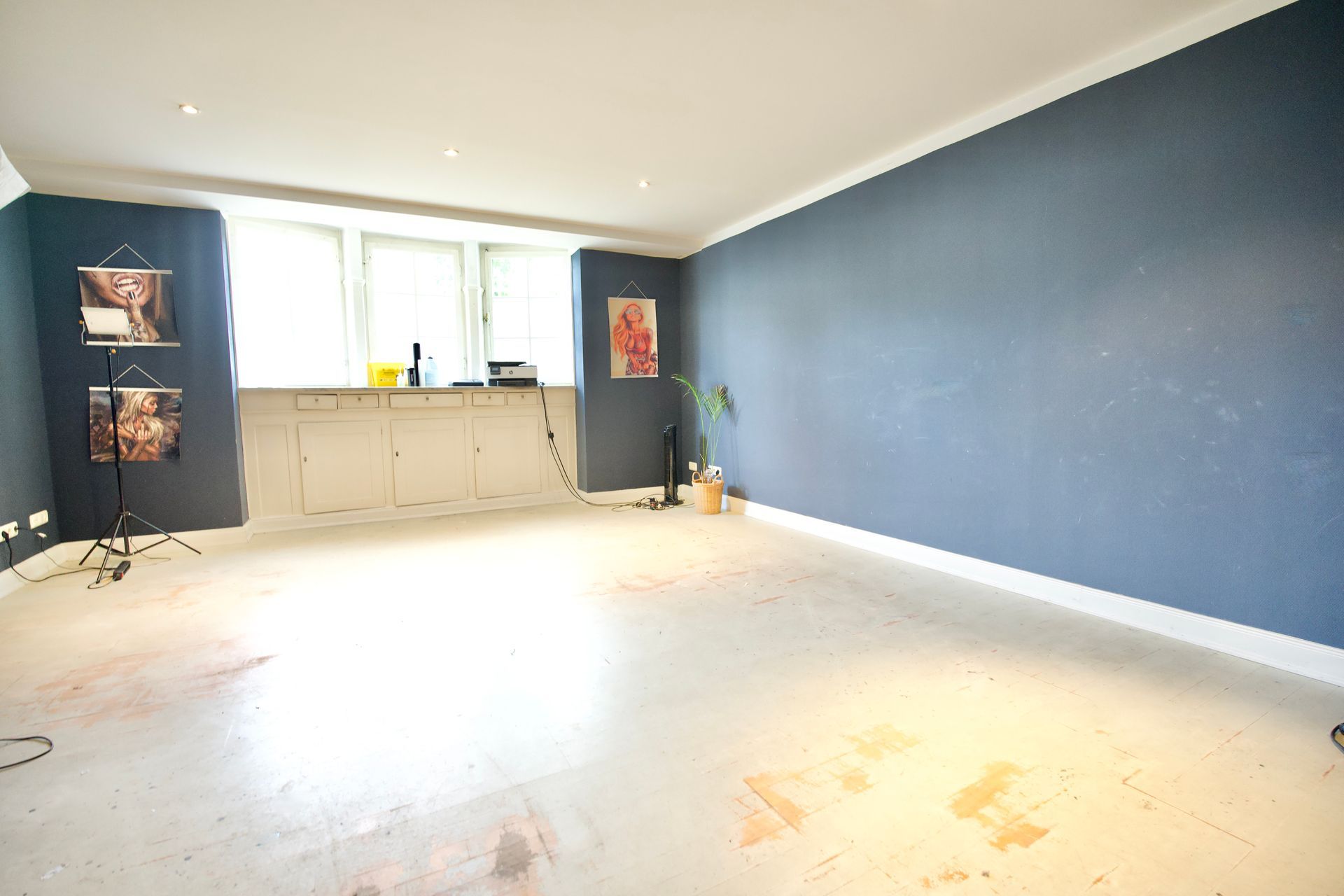 Das großzügige Studiozimmer, das den Mittelpunkt dieser besonderen Wohnung darstellt, besticht durch eine Wohnfläche von über 38 m2 und lässt durch seine großzügigen Erkerfenster reichlich Tageslicht in die Wohnräume strömen. Dank seiner Großzügigkeit bietet das Studiozimmer sogar die Möglichkeit, eine offene Kochinsel zu integrieren. Der Boden ist mit weiß lackierten Holzdielen in "Used-Optik" veredelt, was den Raum zusätzlich verfeinert.